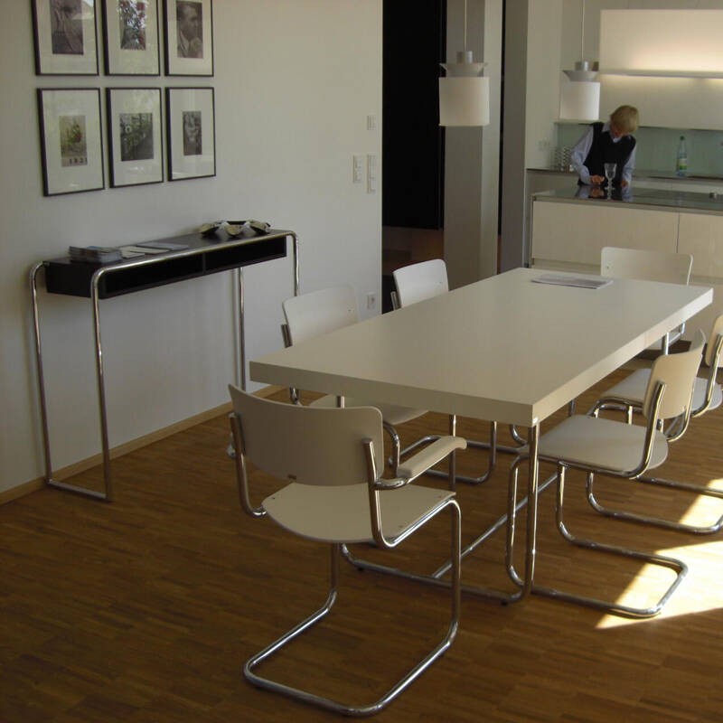 B 108 de chez Thonet est une console élégante et bien conçue, dotée de compartiments de rangement. Le design de cette console date 1930/31 et a été présentée dans le catalogue Thonet au même moment. L'invention du mobilier en acier tubulaire est étroitement liée à Thonet. À partir des années 1920, plusieurs modèles ont été conçus en interne, dont la console B 108. Elle s'adapte à de nombreux environnements tels que les salons ou salles à dîner, entrées ou bureaux.