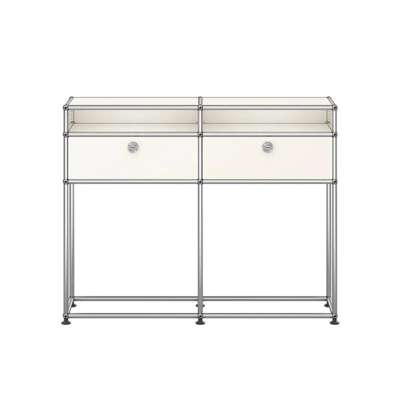 Créés par l'architecte Fritz Haller et l'industriel visionnaire Paul Schärer, les meubles USM sont fabriqués en Suisse depuis plus de 50 ans et sont reconnus dans le monde entier. La qualité de fabrication des meubles USM HALLER et leurs lignes intemporelles en font un classique incontournable du design, qui trouve sa place aussi bien dans les bureaux que dans les plus beaux intérieurs, classiques ou modernes. Sa conception modulaire permet de le faire évoluer au fil du temps selon les besoins et les envies. La console Haller M51 est composée de deux portes abattantes. La console Haller M51 est dotée d'une structure en acier chromé assemblé par des boules de connexion, habillée de panneaux d'acier thermolaqué et monté sur des patins réglables en hauteur. Elle dispose également d’un jeu d’ancrage mural. Portes classiques ne nécessitant pas de clefs. (Sécurisées à la livraison, les portes se déverrouillent pour la première fois à l’aide d’une pièce ou d’une clef normale)