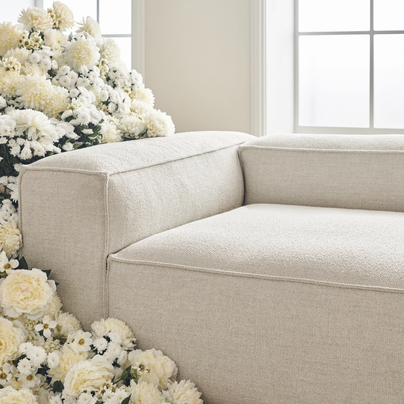 Tissu bouclé monza, bois certifié FSC™, rembourrage plumes, de duvets et de fibres, mousse froide