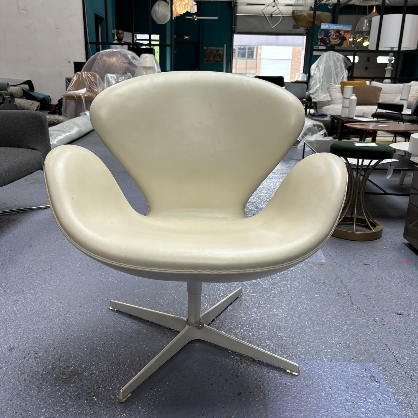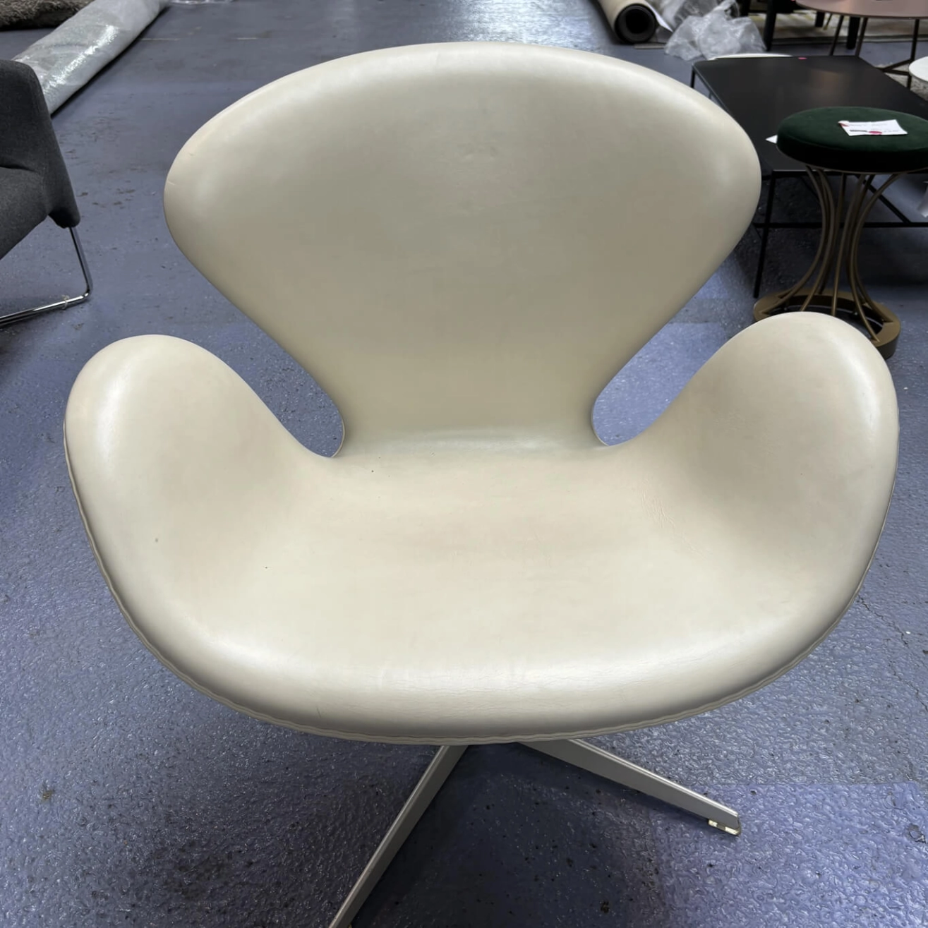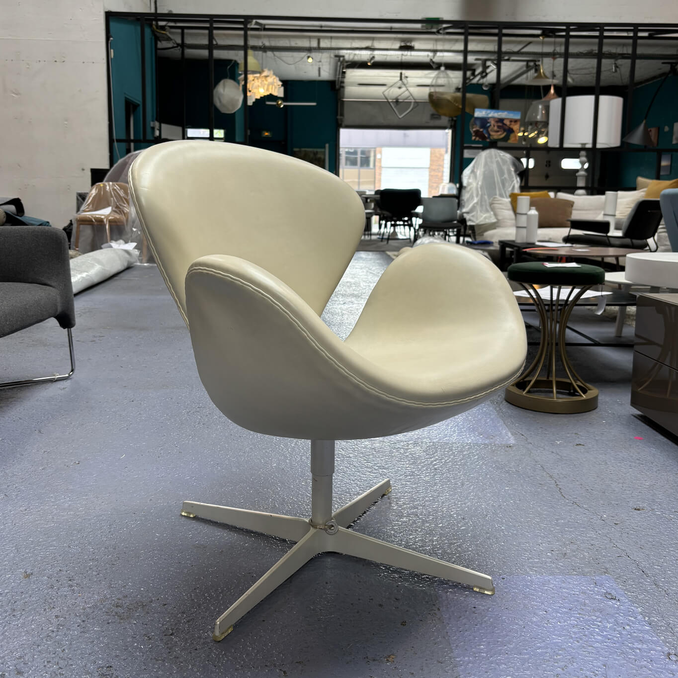 Arne Jacobsen dessina le fauteuil d'occasion Cygne ainsi que le fauteuil Oeuf pour le hall et la réception du Royal Hotel, à Copenhague. Ce projet permit à Jacobsen de concevoir un projet global, intégrant architecture et design du mobilier. En 1958, le fauteuil Cygne était une innovation technologique éditée par Fritz Hansen , ne présentant que des courbes et aucune ligne droite. La coque est moulée en matériau synthétique et rembourrée de mousse polyuréthane, la base est en aluminium poli. Il est disponible en cuir ou en tissu. Le fauteuil Cygne d'occasion de Fritz Hansen est idéal aussi bien pour les espaces publics que pour l'habitat dans le salon, près de la cheminée les soirs d'hiver ou encore dans une chambre.