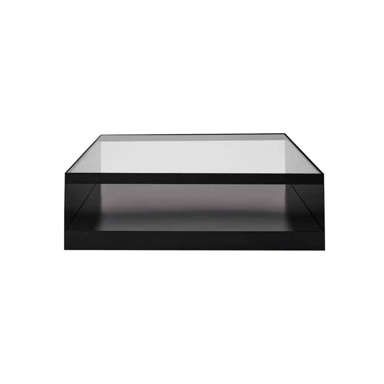 Structure feuille d’acier découpée et pliée, complétée d’un panneau de particules de bois placé en fond, plateau en verre, verre trempé noir ou transparent ou verre armé transparent, roulettes dissimulées sous la structure