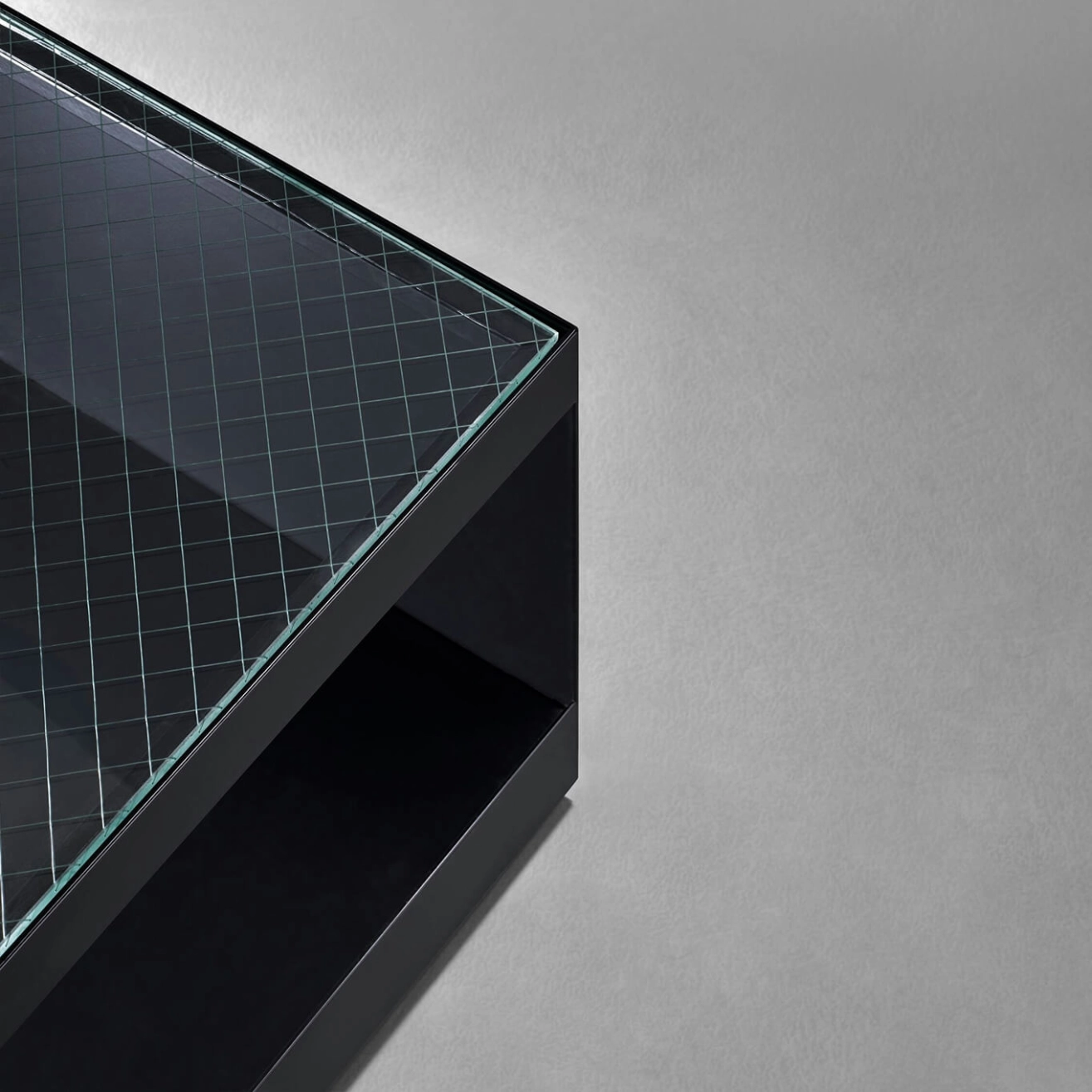 Structure feuille d’acier découpée et pliée, complétée d’un panneau de particules de bois placé en fond, plateau en verre, verre trempé noir ou transparent ou verre armé transparent, roulettes dissimulées sous la structure