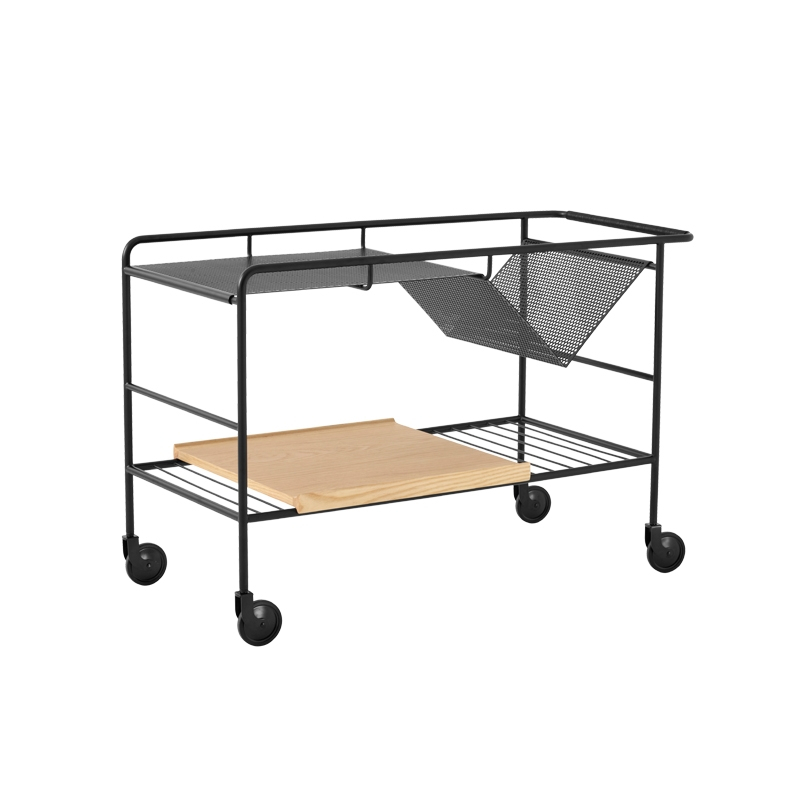 acier chrome ou noir, plateau chêne ou noyer, poignée cuir