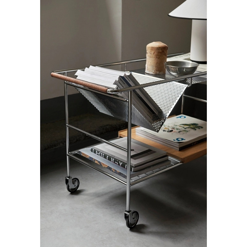 Editée par And Tradition, Alima est une desserte légère, élégante et fonctionnelle. Inspiré par le « chaos créatif » du travail à la maison, Note Design Studio a décidé de créer un rangement qui accueillerait facilement leur collection de livres, magazines, dessins et objets. Le résultat est une desserte élégante avec un emplacement en forme de V, qui permet de ranger ou d’exposer facilement les livres. Ainsi son nom reflète parfaitement sa fonction savante : Alima est un nom arabe qui signifie « érudit » ou « sage ». Idéale du salon à la cuisine, d’un espace de travail à un restaurant, Alima est dotée d’une structure métallique robuste en finition chromée ou noire matte, qui contraste avec la poignée en cuir et le plateau amovible, disponible en chêne ou noyer. Ses roulettes assurent une manœuvre facile, permettant à cette desserte d’être utilisée de différentes manières dans un intérieur, que ce soit en table d’appoint ou en rangement sous un bureau.