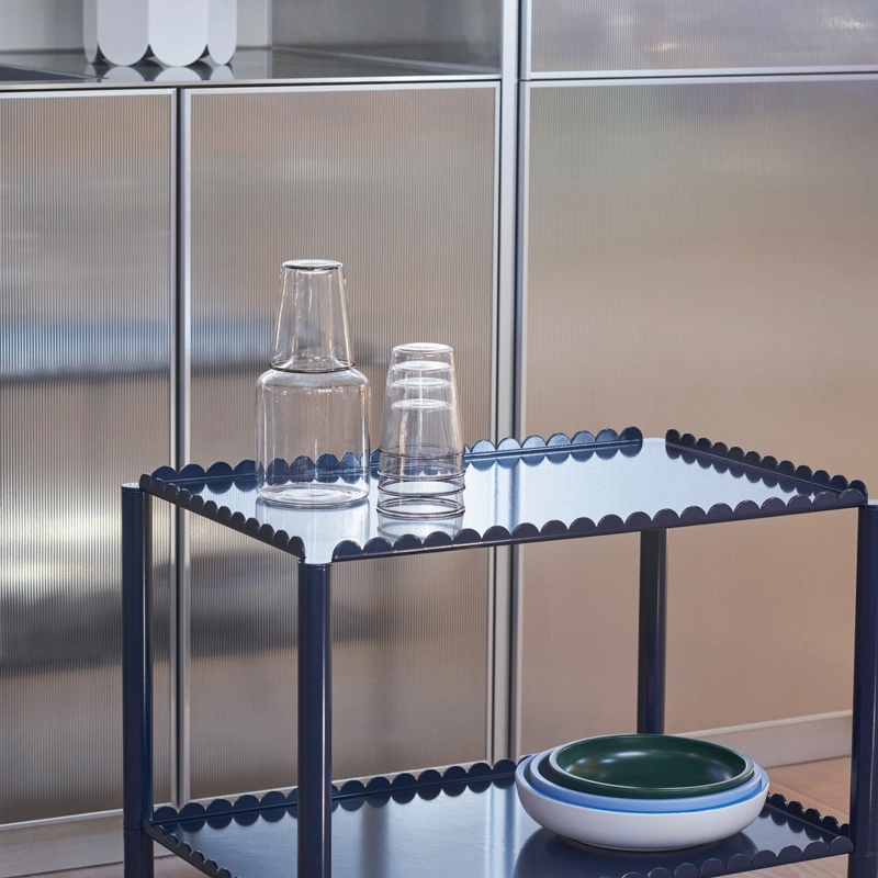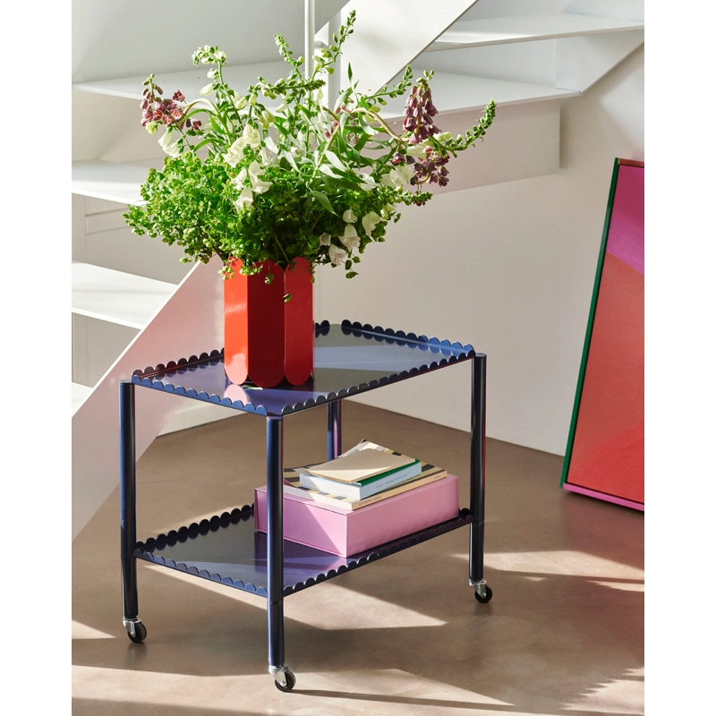 Dessinée par le duo belge Muller Van Severen pour Hay, la desserte Arcs est une pièce fonctionnelle et décorative qui se distingue par une chaine d’arcs verticaux. Petit meuble doté d’une présence forte, Arcs combine des techniques industrielles avec des lignes poétiques pour créer une expression unique et sculpturale. La structure élégante et festonnée soutient deux ou trois plateaux, avec des pieds fins montés sur roulette pour une manœuvre facile. Réalisée en acier thermolaqué dans plusieurs couleurs, la desserte Arcs s’intègre dans différentes pièces de la maison : dans le salon pour exposer ou ranger des objets, dans la cuisine pour créer un rangement supplémentaire, ou encore dans la chambre comme table de chevet.