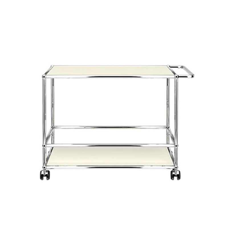 La desserte à roulettes Haller L est dotée d'une structure en acier chromé assemblé par des boules de connexion, habillée de panneaux d'acier thermolaqué et monté sur roulettes.