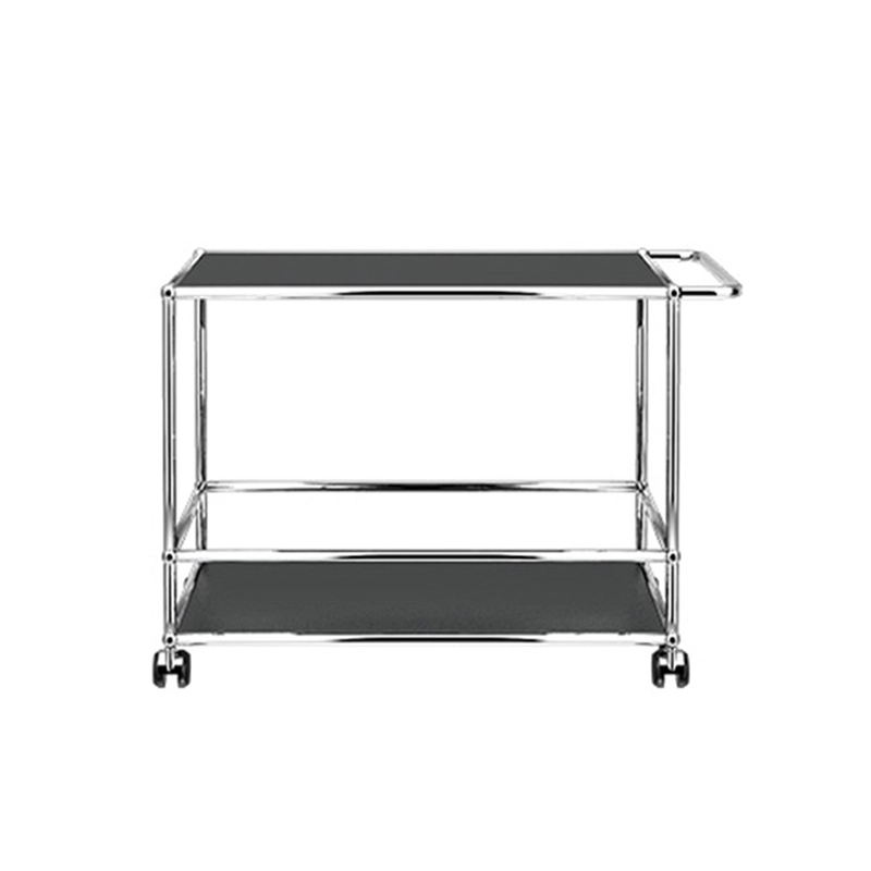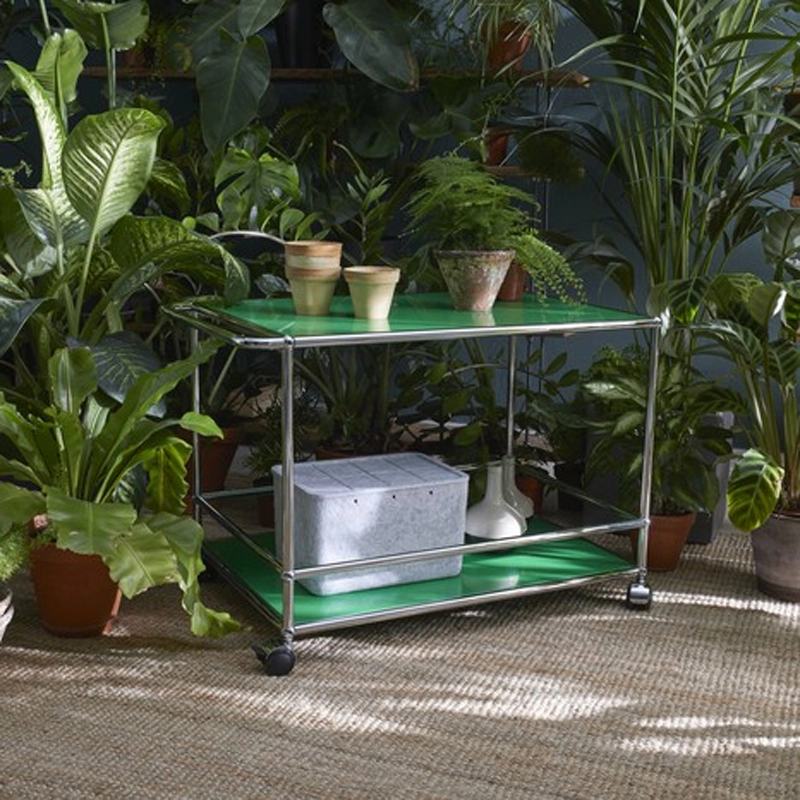 La desserte à roulettes Haller L est dotée d'une structure en acier chromé assemblé par des boules de connexion, habillée de panneaux d'acier thermolaqué et monté sur roulettes.