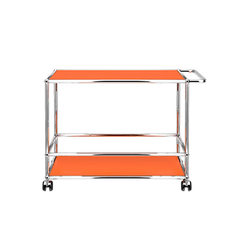 La desserte à roulettes Haller L est dotée d'une structure en acier chromé assemblé par des boules de connexion, habillée de panneaux d'acier thermolaqué et monté sur roulettes.