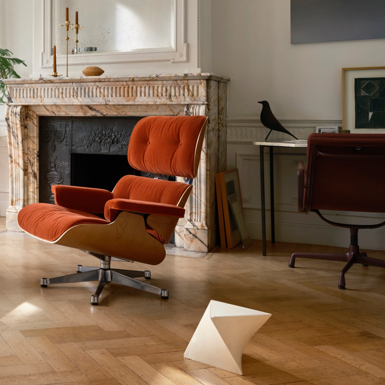 Charles Eames, décédé à 71 ans en 1978 à Saint-Louis, sa ville natale, est l'une des figures emblématiques du design du XXe siècle, ayant su orienter ce domaine vers la production de masse. Architecte de formation, il remporte en 1940, avec Eero Saarinen, le premier prix du concours de design organique du MoMA de New York, ce qui lui permet d'enseigner le design industriel à la Cranbrook Academy. C'est là qu'il rencontre Ray, qui y étudie la peinture. Charles et Ray Eames se marient en 1941 et s'installent à Los Angeles, où ils commencent à expérimenter ensemble les techniques de moulage tridimensionnel du contreplaqué, dans le but de créer des chaises à la fois confortables et abordables.  Leur développement d'attelles et de civières en contreplaqué pour l’armée américaine les pousse à perfectionner cette technologie, qui sera utilisée pour la production de mobilier par Herman Miller (en 1946) puis par Vitra (en 1957). En 1948, Charles et Ray Eames participent au concours « Low-Cost Furniture » du MoMA, et en 1949, ils construisent la maison Eames, qui devient leur résidence privée. Leur célèbre fauteuil Eames Lounge Chair a été commercialisé à plus de 6 millions d'exemplaires depuis sa création en 1956, tandis que l'Aluminium Chair, qui a donné naissance à l'Aluminium Group en 1958, ainsi que le fauteuil pivotant Soft Pad avec son repose-pieds (1969), continuent de séduire les amateurs de design et sont même garantis pendant 30 ans. En plus de leur travail dans le mobilier et l'architecture, Charles et Ray Eames explorent régulièrement d'autres domaines comme le graphisme, la photographie, la réalisation de films et d'expositions. Pour Vitra, la collaboration avec Charles et Ray Eames est d'une importance fondamentale. C'est avec la production de leurs créations en 1957 que l'histoire de Vitra en tant que fabricant de mobilier commence. Toutefois, l'impact du couple ne se limite pas seulement à leurs produits ; leur vision du design continue de façonner les valeurs et l'orientation de l'entreprise, même aujourd'hui. La philosophie de conception de l'ensemble de la collection Eames influence toujours les valeurs, l'orientation et les objectifs de Vitra. Cela se manifeste particulièrement dans la question récurrente que se pose l'entreprise lors de décisions importantes en matière de design : « Que diraient Charles et Ray ? » Au cours de leur vie commune, le couple a donné des réponses lors de leurs voyages en Europe et de leurs retours en Californie. De nombreux éléments rapportés de voyage, comme le célèbre Eames House Bird, peuvent être retrouvés dans la maison Eames.