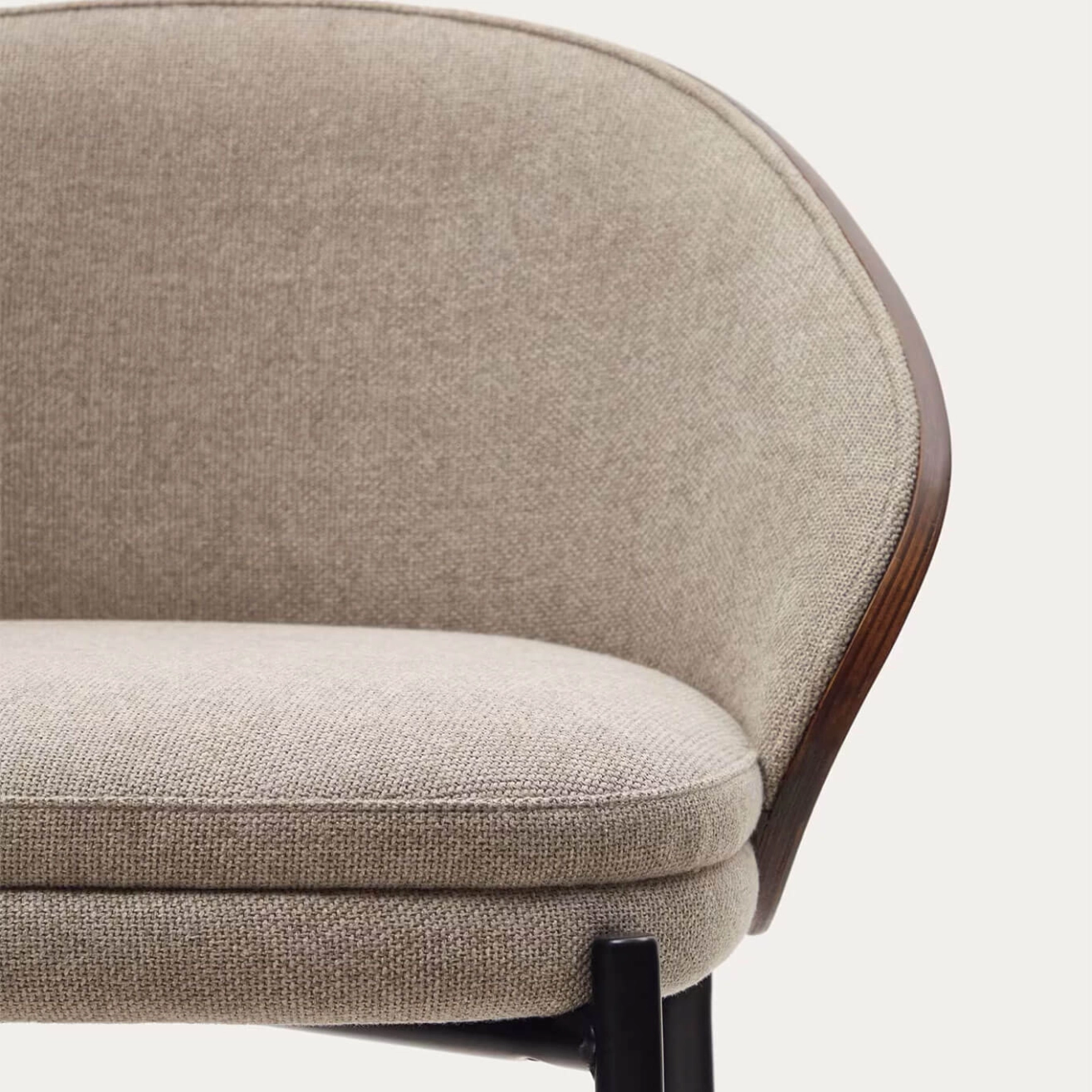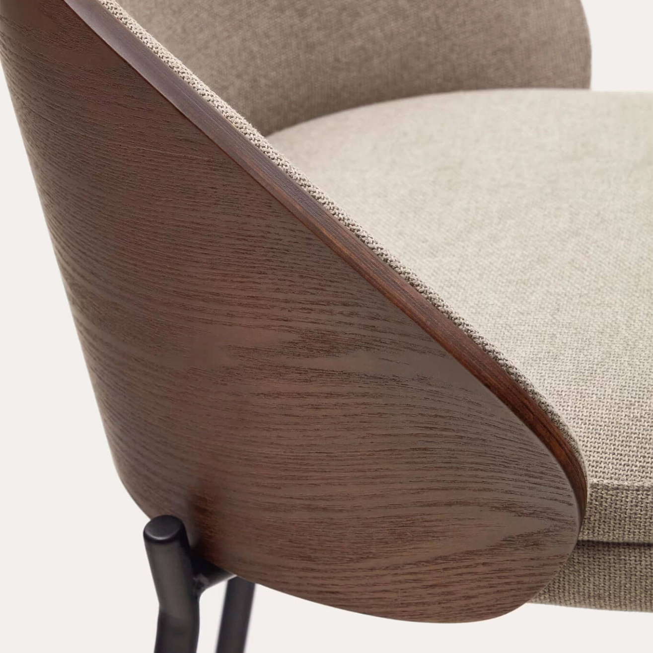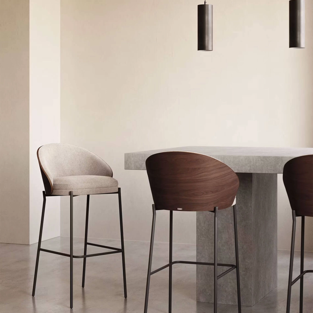 Le tabouret haut Eamy séduit par son design élégant et harmonieux, combinant trois matériaux soigneusement sélectionnés. Son dossier courbé en placage de frêne finition wengué apporte une touche chaleureuse et raffinée, tandis que sa structure en métal noir mat assure stabilité et légèreté visuelle. Revêtu d’un tissu chenille marron clair, doux et résistant, il offre un confort remarquable pour accompagner tous vos moments autour du bar ou du plan de travail. Ce modèle incarne parfaitement l’esprit de la marque.