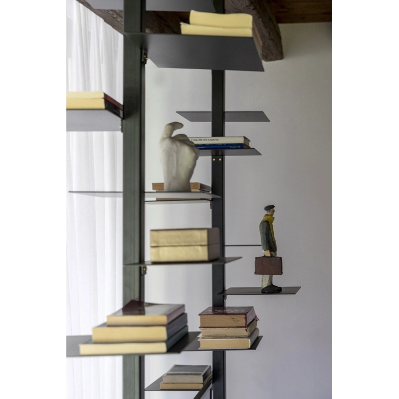 rangement élégant se fixe entre le sol et le plafond grâce à une tige verticale réglable pour s’adapter à la hauteur sous plafond de votre pièce. Sur les quatre côtés de la structure sont fixées 13 étagères de différentes dimensions (20x30 cm et 25x30 cm) qui créent un effet visuel dynamique et graphique. Grâce à son système d’accroche, l’