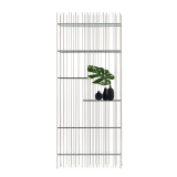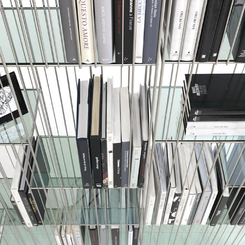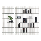Metrica, le rythme est marqué par les tiges métalliques fixées à différents intervalles sur une structure rigoureuse. Les livres et les objets qui s’y installent viennent compléter la forme et l’allure finale. Grâce à sa composition en tiges de métal et en verre,