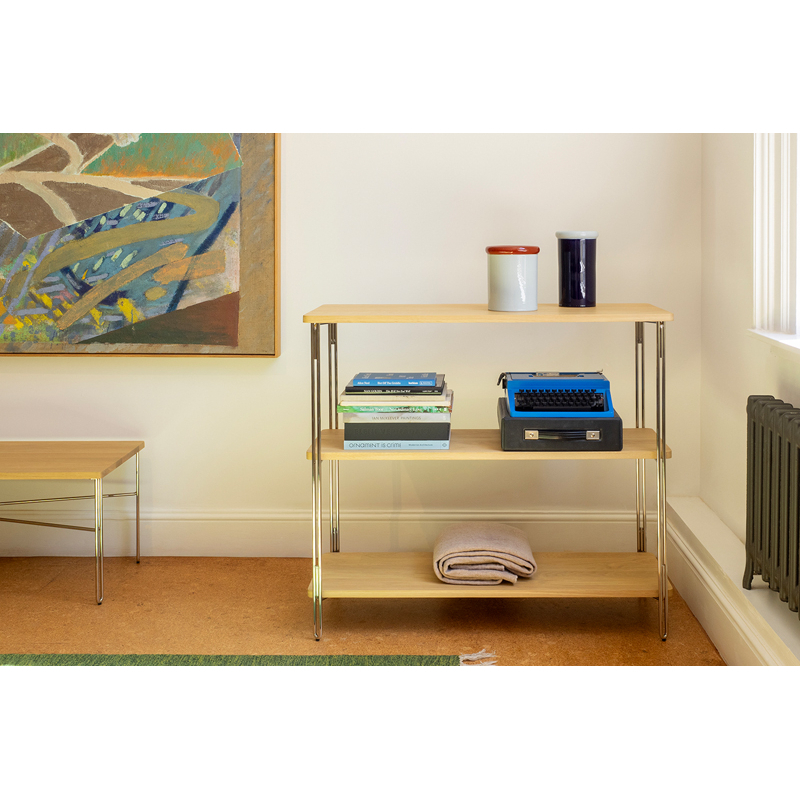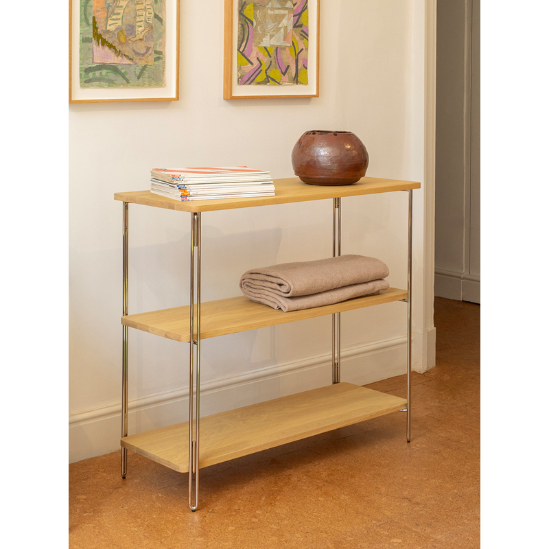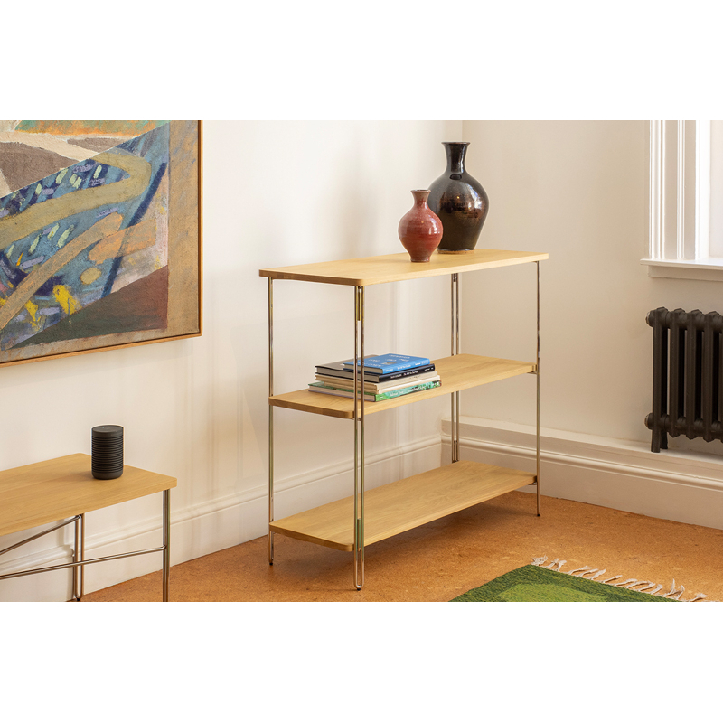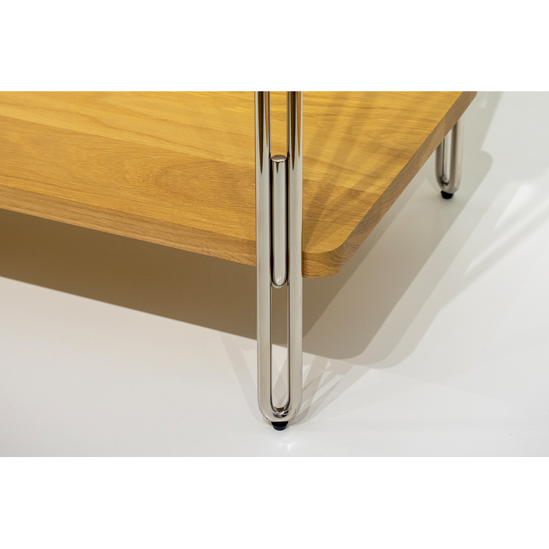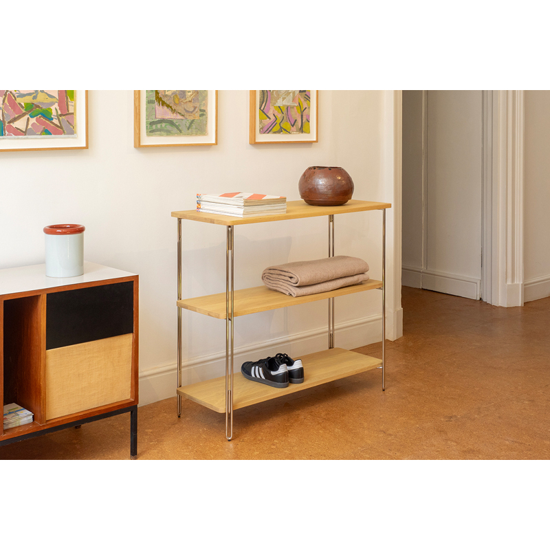 Avec Inline, Julien Renault crée une collection de meubles simples et élégants, qui se distinguent par leurs structures faites de lignes parallèles en acier inoxydable. Ces créations sont basées sur les dessins du designer Julien Renault, où des simples lignes droites aux rayons serrés se réunissent pour créer des structures élégantes et solides. La structure de l'étagère Inline est fabriquée en acier inoxydable poli, tandis que les tablettes sont réalisées en chêne massif. Editée par Nine, l'étagère Inline se décline en version murale. La collection comprend aussi trois tables basses.