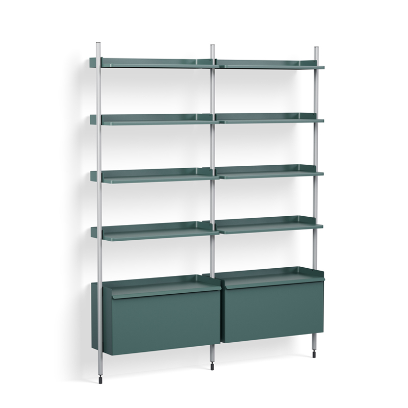 Dessiné par les célèbres designers Ronan & Erwan Bouroullec, Pier System est un système de rangement multifonctionnel, développé pour s’adapter aux conditions vie moderne. Livré à plat et facile à monter, à reconfigurer et à recycler, Pier System est doté d’une construction simple et flexible, qui permet de ranger et d’organiser de nombreux types d’objets. Réalisé à partir d’aluminium et d’acier en utilisant le minimum de composants nécessaires à un système de rangement complet, Pier System est disponible dans différentes couleurs et de nombreuses configurations, qui peuvent être combinées ensemble. Les éléments des configurations peuvent être déplacés selon les besoins ou les envies, pour intégrer les fonctions que l’on souhaite. Edité par Hay, le système de rangement Pier trouve sa place dans toutes les pièces de la maison, que ce soit le salon, la chambre, l’entrée ou le bureau. Il est également adapté aux espaces contract. La configuration 122 est dotée de deux rangements avec portes abattantes et de huit étagères.