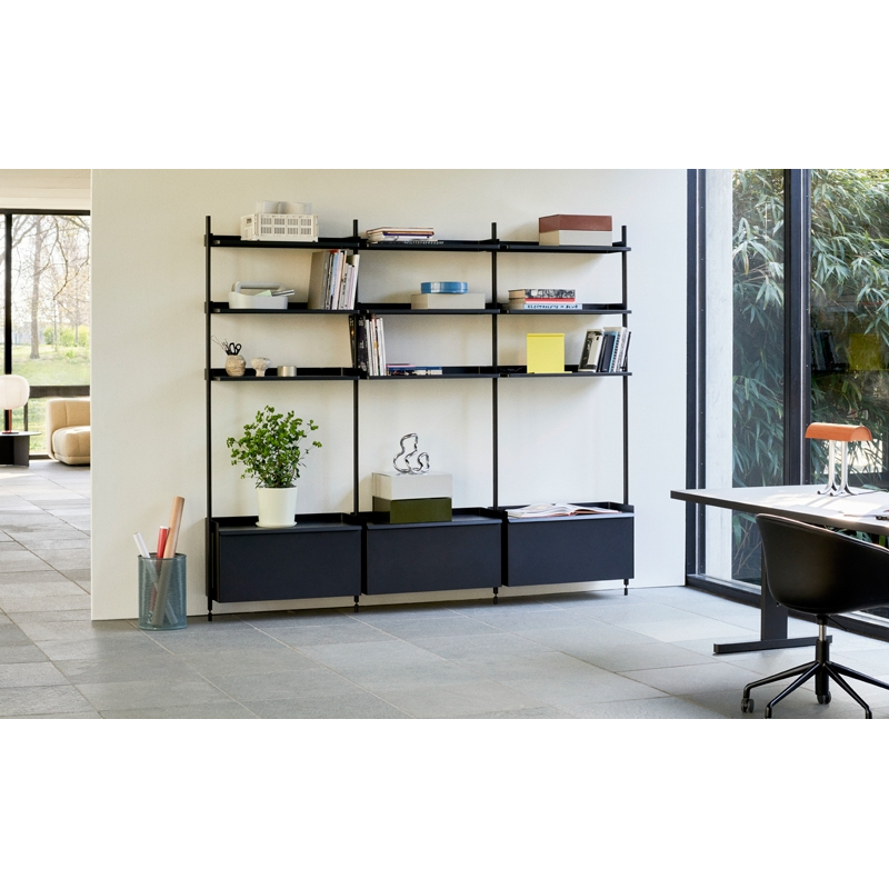 Dessiné par les célèbres designers Ronan & Erwan Bouroullec, Pier System est un système de rangement multifonctionnel, développé pour s’adapter aux conditions vie moderne. Livré à plat et facile à monter, à reconfigurer et à recycler, Pier System est doté d’une construction simple et flexible, qui permet de ranger et d’organiser de nombreux types d’objets. Réalisé à partir d’aluminium et d’acier en utilisant le minimum de composants nécessaires à un système de rangement complet, Pier System est disponible dans différentes couleurs et de nombreuses configurations, qui peuvent être combinées ensemble. Les éléments des configurations peuvent être déplacés selon les besoins ou les envies, pour intégrer les fonctions que l’on souhaite. Edité par Hay, le système de rangement Pier trouve sa place dans toutes les pièces de la maison, que ce soit le salon, la chambre, l’entrée ou le bureau. Il est également adapté aux espaces contract. La configuration 132 est dotée de trois rangements avec portes abattantes et de neuf étagères.