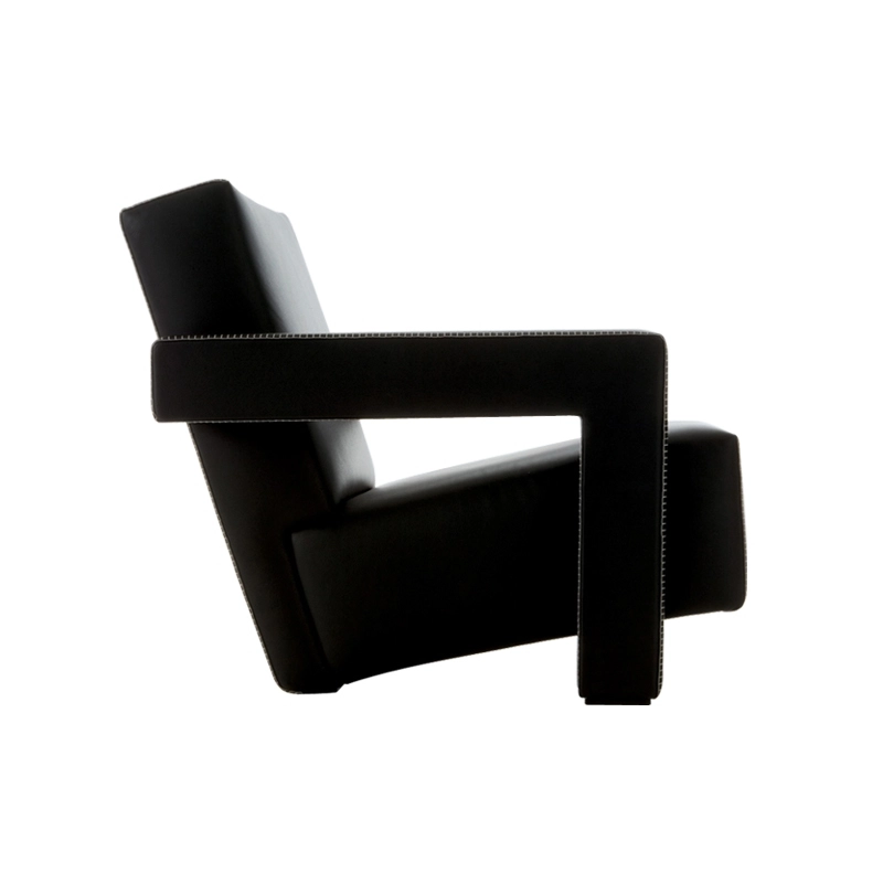 Dessiné en 1935, le fauteuil Utrecht est un classique du design, symbolisant parfaitement le travail de Gerrit Thomas Rietveld par ses formes géométriques élémentaires. Entièrement revêtu, c'est un fauteuil qui va à l'essentiel, avec pour unique détail esthétique, les surpiqures qui mettent en valeur les lignes du siège. Réédité par Cassina, Utrecht est composé d'une structure portante en acier, rembourrée de mousse de polyuréthane et de ouate de polyester. Il est proposé ici avec un revêtement en cuir noir, intemporel et des surpiqures blanches. Ce fauteuil bas s'intègre facilement dans tous les intérieurs grâce à ses proportions réduites, et son design qui traverse les générations.