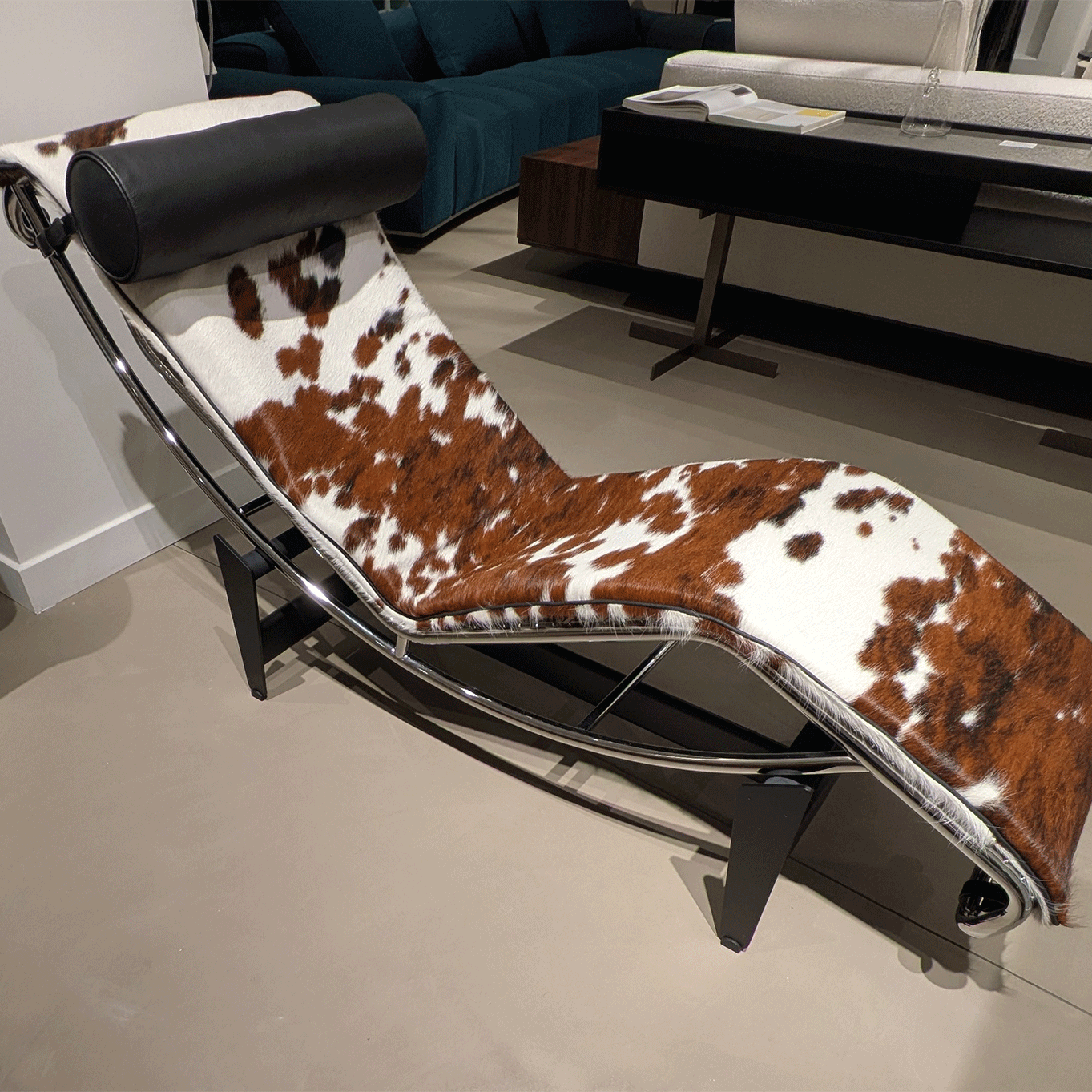 4 Chaise Longue peut être inclinée dans plusieurs positions grâce à sa structure en arc de cercle. Quelque soit son angle d'inclinaison, la stabilité de la 4 Chaise Longue À Réglage Continu Durable en peau tachetée vache est assurée par le frottement avec des rouleaux en caoutchouc qui enveloppent les barres transversales du piètement. L'assise, légèrement rembourrée en polyuréthane et revêtue de cuir ou de peau, est fixée au châssis par des sangles élastiques, qui assurent la structure portante. Grand classique du design de la maison Cassina, le modèle