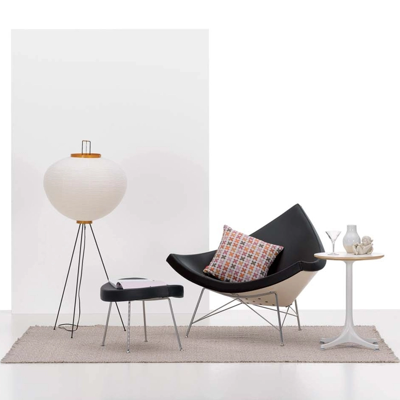 Dessiné par George Nelson, le Coconut Chair est un fauteuil typique du design des années 50. Il se caractérise par une ligne pleine d'humour et des formes pures et graphiques. George Nelson avait pour habitude de comparer cette pièce à une noix de coco qui se serait ouverte en huit morceaux. Il a volontairement inversé les couleurs avec la coque extérieure réalisée en matière synthétique en blanc, tandis que le rembourrage, réalisé en une seule pièce de mousse, est recouvert de cuir noir. Vitra édite ce petit fauteuil, accueillant et confortable, évoquant la nature, qui permet d'adopter la position que l'on veut dans son salon, la chambre ou le bureau.