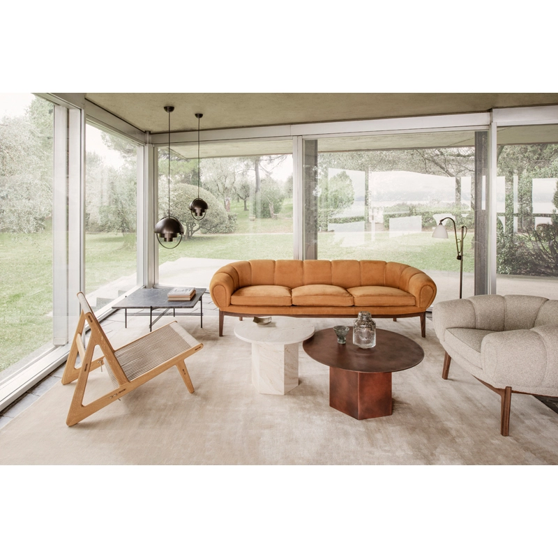 Dessinée par l’architecte et designer danois Illum Wikkelsø en 1962, la collection Croissant est une version élégante et ludique des traditionnels canapés et fauteuils Chesterfield. Pour Wikkelsø, un fauteuil ne doit pas uniquement servir à s’assoir droit, mais doit aussi être confortable quel que soit la position adoptée. Ainsi, il revisite ces pièces classiques pour un public plus détendu qui émerge dans l’optimisme des années 60. Avec sa forme caractéristique et gourmande de viennoiserie, le fauteuil Croissant se démarque avec un certain sens de l’humour dans tous les intérieurs. Il apporte sa personnalité à lui tout seul de votre salon, mais peut aussi très bien être associé à d’autres meubles au caractère fort. Gubi réédite cette magnifique pièce et rend hommage au design original, en respectant sa présence sculpturale et théâtrale, ses courbes organiques et une fabrication artisanale.