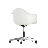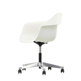 La Eames Plastic Side Chair est la version actualisée de la légendaire Fiberglass Chair de Charles et Ray Eames. Conçue en collaboration avec Zenith Plastics pour le concours « Low Cost Furniture Design » du Museum of Modern Art de New York en 1950, elle fut la première chaise en matière plastique de fabrication industrielle. Edité par Vitra, le fauteuil Eames Plastic PACC  (Pivot Armchair Cast base on Castors) est doté d'un piétement à roulettes. La coque aux lignes organiques, qui assure un excellent confort, s'associe à ce piètement pivotant et transforme la le siège en fauteuil de bureau.