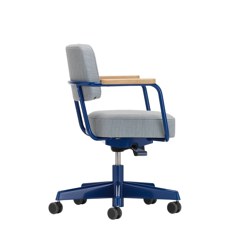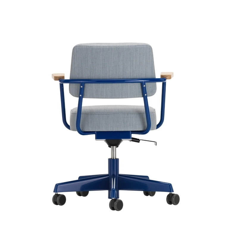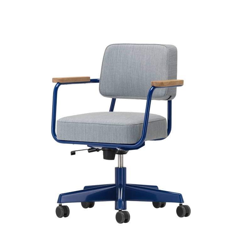 Conçu en 1951 par le designer français Jean Prouvé, le Fauteuil Direction Pivotant est toujours aussi actuel grâce à son esthétique caractéristique et ses exigences fonctionnelles. Edité par Vitra, il est doté d’une assise et d’un dossier rembourrés généreux, reposant sur un cadre élégant réalisé en tube d‘acier et en tôle pliée. Les accoudoirs en bois, quant à eux, confèrent au siège de bureau une note de confort familier.