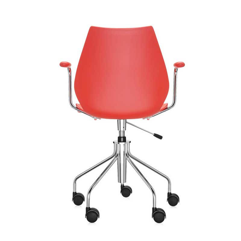 Vico Magistretti dessine pour Kartell le fauteuil de bureau Maui qui se caractérise par son élégance et la sobriété de ses coloris. Avec ses formes simples, Maui est un siège pratique, qui s'adapte à tous les intérieurs : aussi bien en tant que chaise de bureau que pour la table de la salle à manger. Réalisé en polypropylène fixé sur une structure en acier chromé, Il est équipé d'accoudoirs, d'un piètement à roulettes et se règle en hauteur. La collection Maui est devenue un best-seller de la marque Kartell, déclinée dans des couleurs vives ou chromatiques.