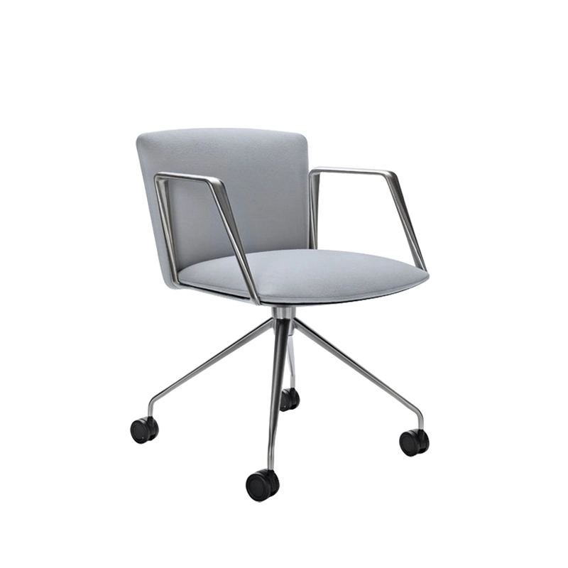 Le fauteuil Véla se décline en une vaste gamme de modèles conçus, à la fois sur le plan esthétique et fonctionnel, pour être intégrés dans des environnements de bureaux, de soft-contract et des espaces résidentiels. La technologie renferme un mécanisme « sensible » sophistiqué intégré dans le corps de l'assise qui permet d'adapter automatiquement la posture en fonction du poids de l'utilisateur. Le réglage de l'assise se fait grâce à une commande, intégrée dans la base des sièges, pratique à atteindre et discrète. Les bases ont été conçues en poussant la technologie de traitement du métal à ses limites. Des tubes en acier en forme de cônes, moulés à froid, avec des coupes variables, se transforment en bases de soutien légères et élégantes. Dessiné par Lievore Altherr Molina pour Tecno, Vela est ici proposé avec un piètement fixe 4 branches roulettes et un revêtement en tissu Lani.