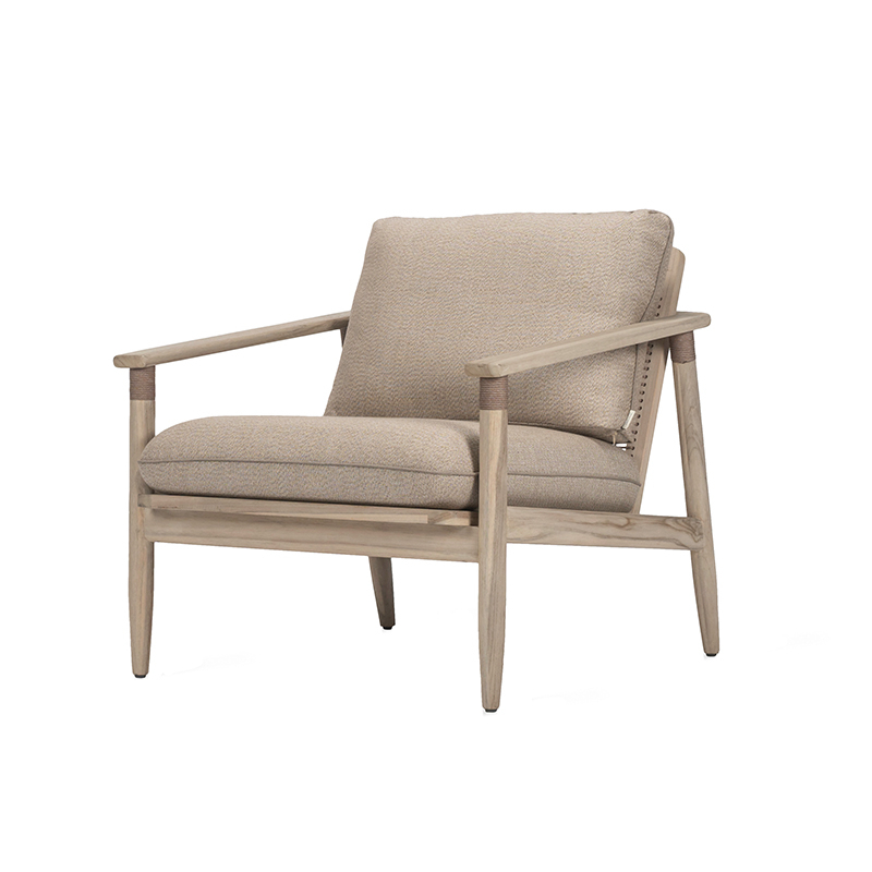 teck teinté brossé, corde en polypropylène greige, coussins mousse quick dry, fibre de polyester, tissu savane coconut s2222, passepoil london stone s0808