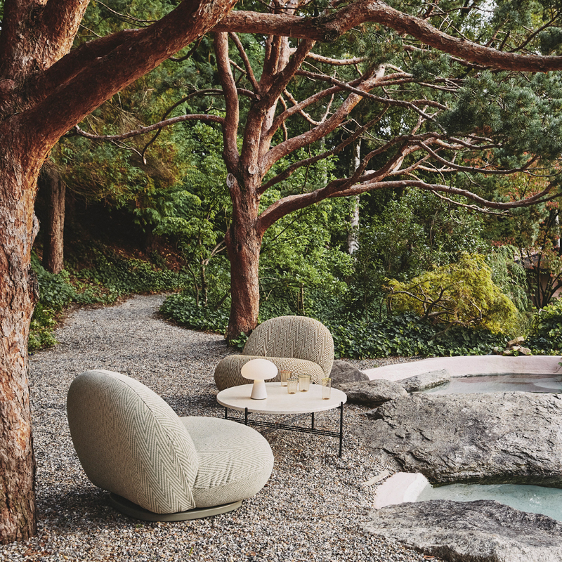 Gubi pour la collection. Celle-ci est à la fois imperméable et respirante, assurant un séchage rapide après une exposition à la pluie, tout en maintenant le confort de l’icône d’origine. La base pivotante est réalisée en contreplaqué résistant à l’humidité et inclut un mécanisme de rotation en acier inoxydable.