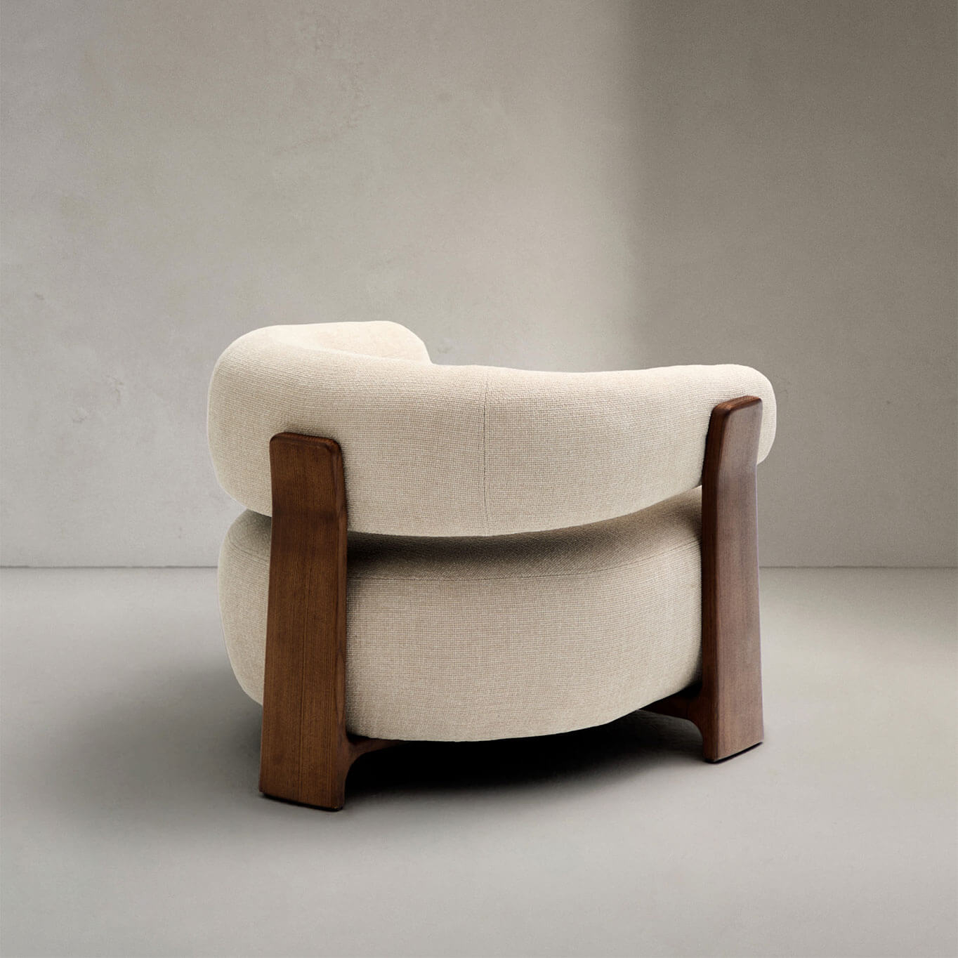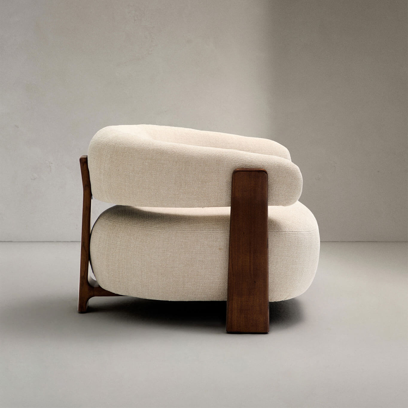 élégance intemporelle, inspirée du style scandinave des années 70, caractérisée par des formes généreuses, enveloppantes et stylisées. Son assise large et son dossier incurvé sont habillés d’un tissu chenille épais, au toucher doux et chaleureux, décliné dans une teinte subtilement nuancée. Ce tissu est composé de