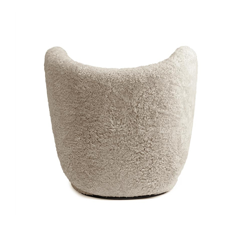 structure contreplaqué, rembourrage mousse, revêtement tissu sheepskin, base pivotante avec retour automatique