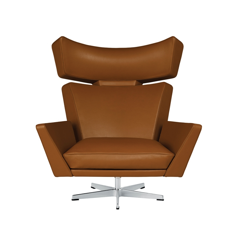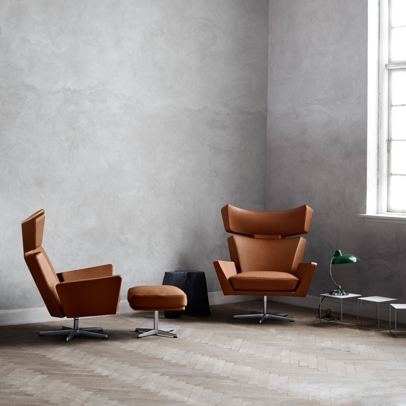 Arne Jacobsen présente pour la première fois en 1966 un fauteuil a l'allure puissante, le fauteuil OKSEN -le "taureau" en danois-. Contrairement à ses autres créations, Oksen n'est pas uniquement réalisé à partir de formes organiques arrondies mais marque n'importe quel espace par ses angles forts et imposants. L'inspiration de l'artiste lui vient d'un voyage aux Etats-Unis, au cours duquel il vit des nombreux fauteuils inclinables aux formes anguleuses que l'on y produisait à l'époque. Oksen accroche le regard dans n'importe quelle pièce et offre en outre un confort exceptionnel. Plusieurs types de cuirs sont disponibles pour ce fauteuil qui saura vous séduire en un coup d’œil.