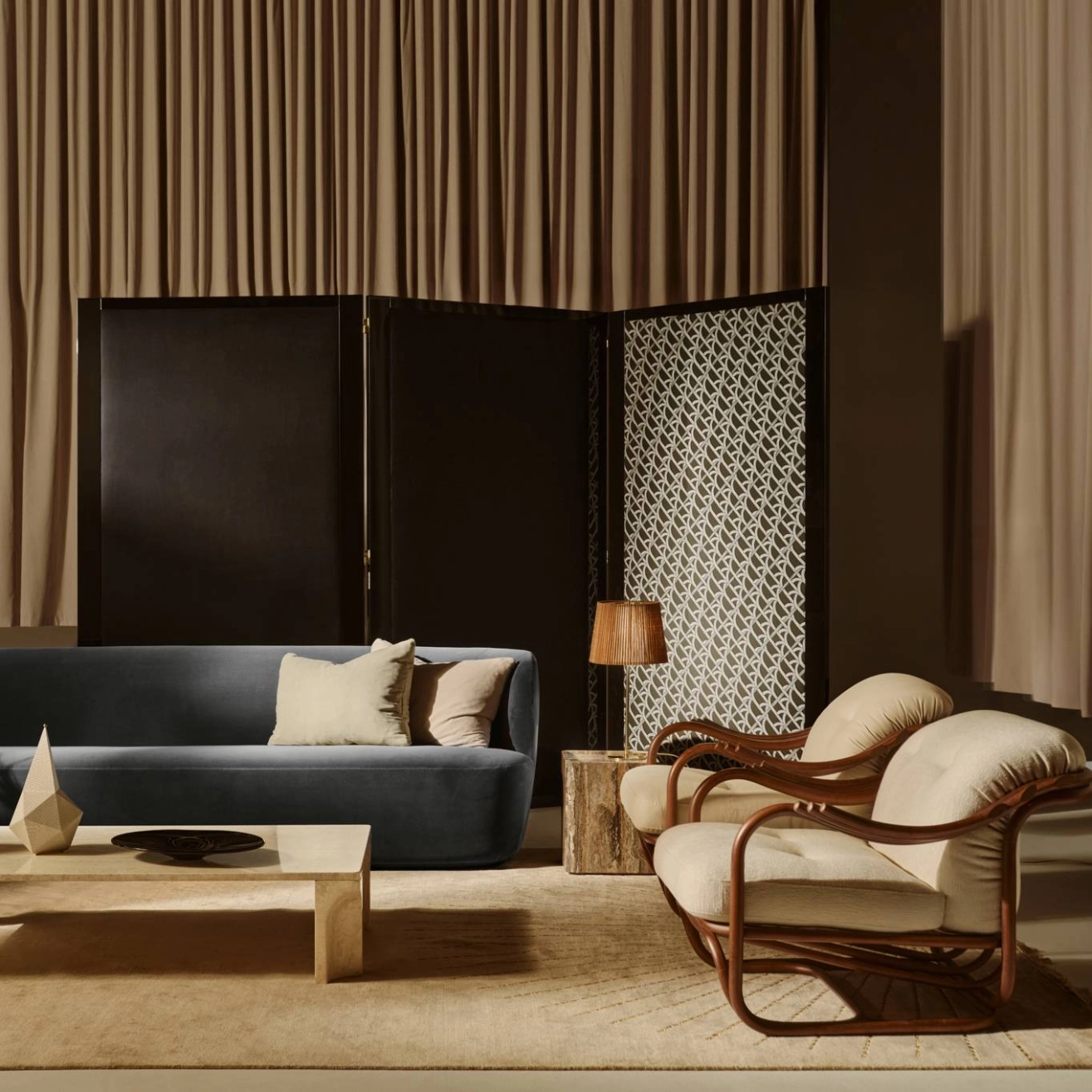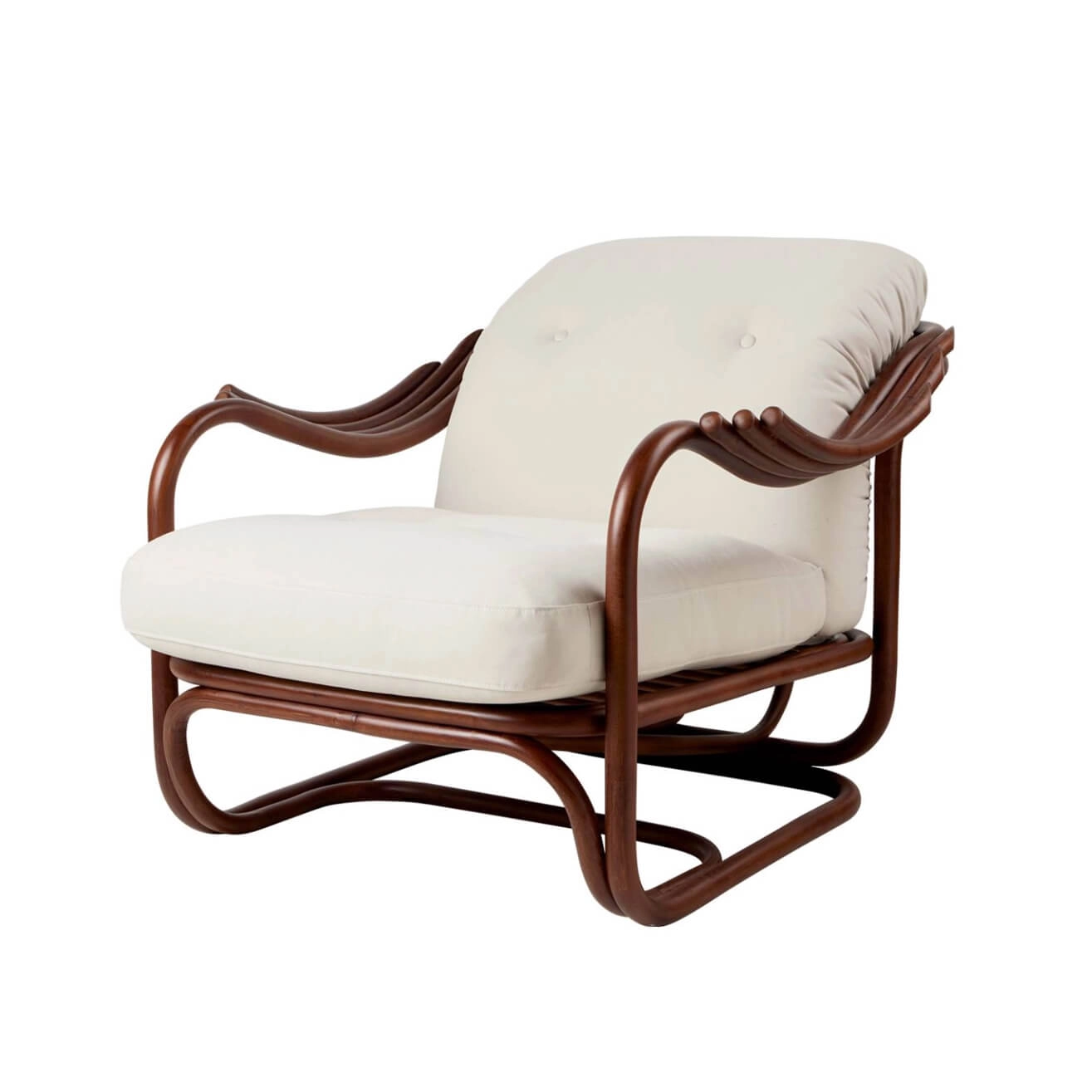 Conçu par Carlo De Carli, figure majeure du design italien du XXe siècle, ce fauteuil révèle une approche raffinée où le respect des matériaux rencontre une esthétique fluide et accueillante. Conjuguant avec élégance la beauté naturelle et le charme organique du rotin à une précision ergonomique méticuleuse, le Poltrona Tria Lounge Chair incarne à la fois l'artisanat d'art et la fonctionnalité. Construit presque entièrement à partir de cannes de rotin cintrées à la vapeur, courbées et fixées à la main, il témoigne d’un savoir-faire traditionnel maîtrisé. Ce procédé artisanal donne naissance à une structure légère et souple, sans compromettre la robustesse ni le confort. Elle se distingue par une paire d’accoudoirs aux courbes gracieuses, dessinant une silhouette à la fois sculpturale et enveloppante, qui capte immédiatement le regard tout en offrant un confort optimal. Deux coussins profondément intégrés viennent renforcer l’expérience d’assise, offrant un soutien moelleux et ergonomique. Leur épaisseur généreuse accentue le caractère accueillant de la chaise, idéale pour les moments de détente prolongés. Pensé pour s’intégrer avec aisance dans tout espace intérieur, le Poltrona Tria insuffle également une sensation de nature et de légèreté, grâce à l’expression authentique de ses matériaux. Le rotin, avec ses variations naturelles, apporte une touche chaleureuse et apaisante, invitant subtilement l’extérieur à entrer dans l’espace domestique.
