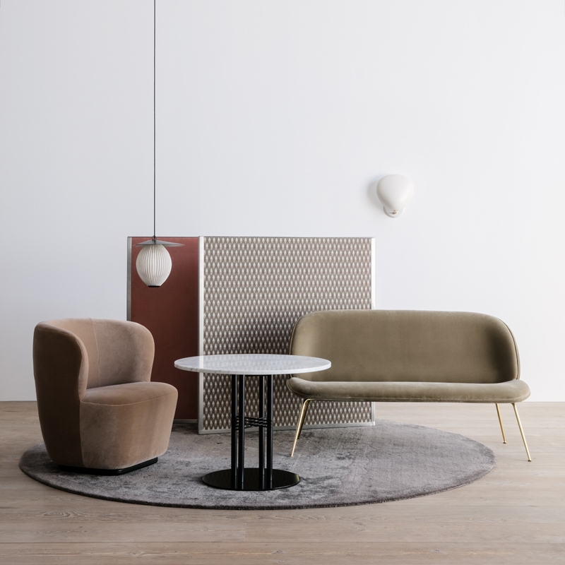 Gubi convient aussi bien aux espaces publics que domestiques tandis que le fauteuil s’intègre très bien dans les espaces de taille limitée où il est essentiel de conserver un certain niveau de confort.