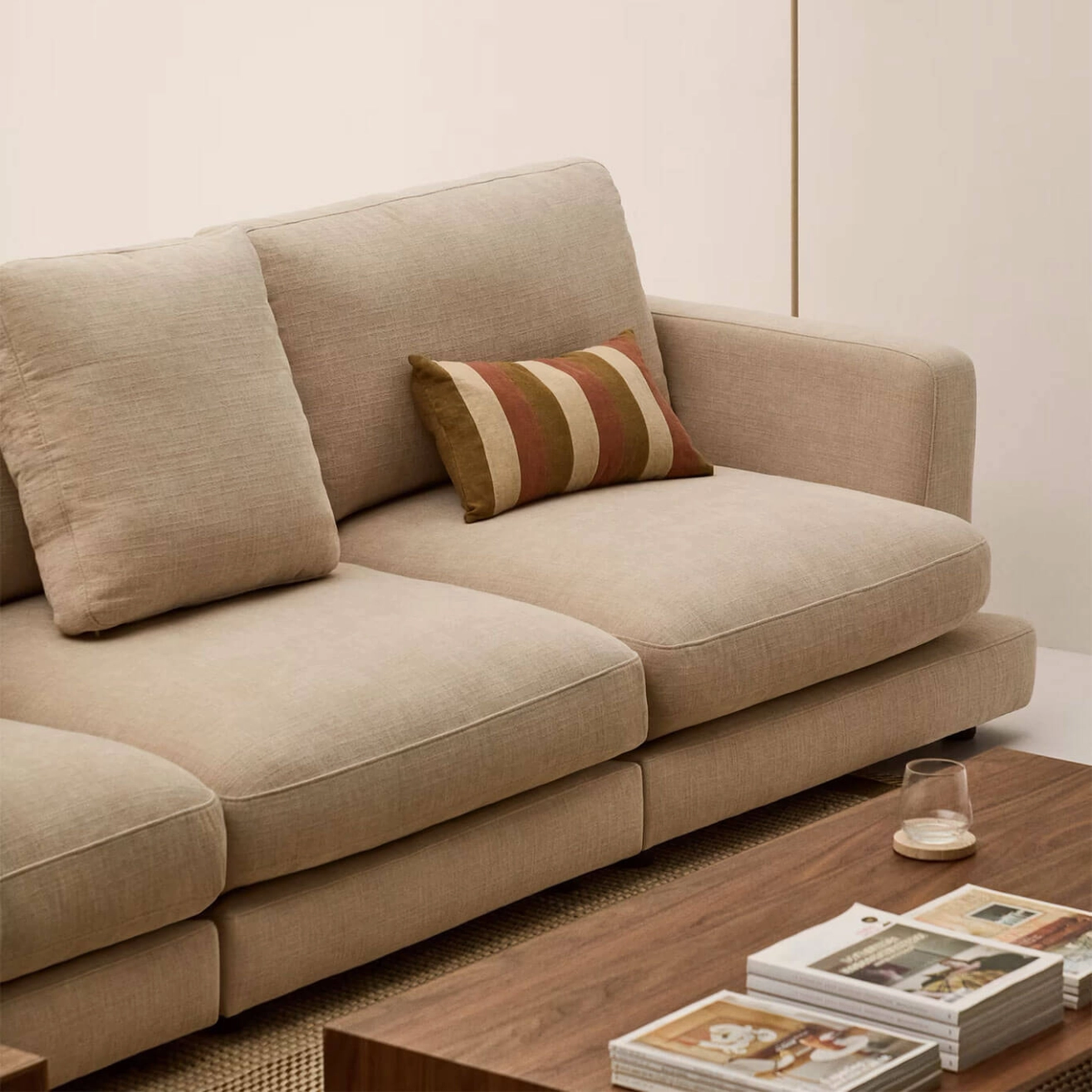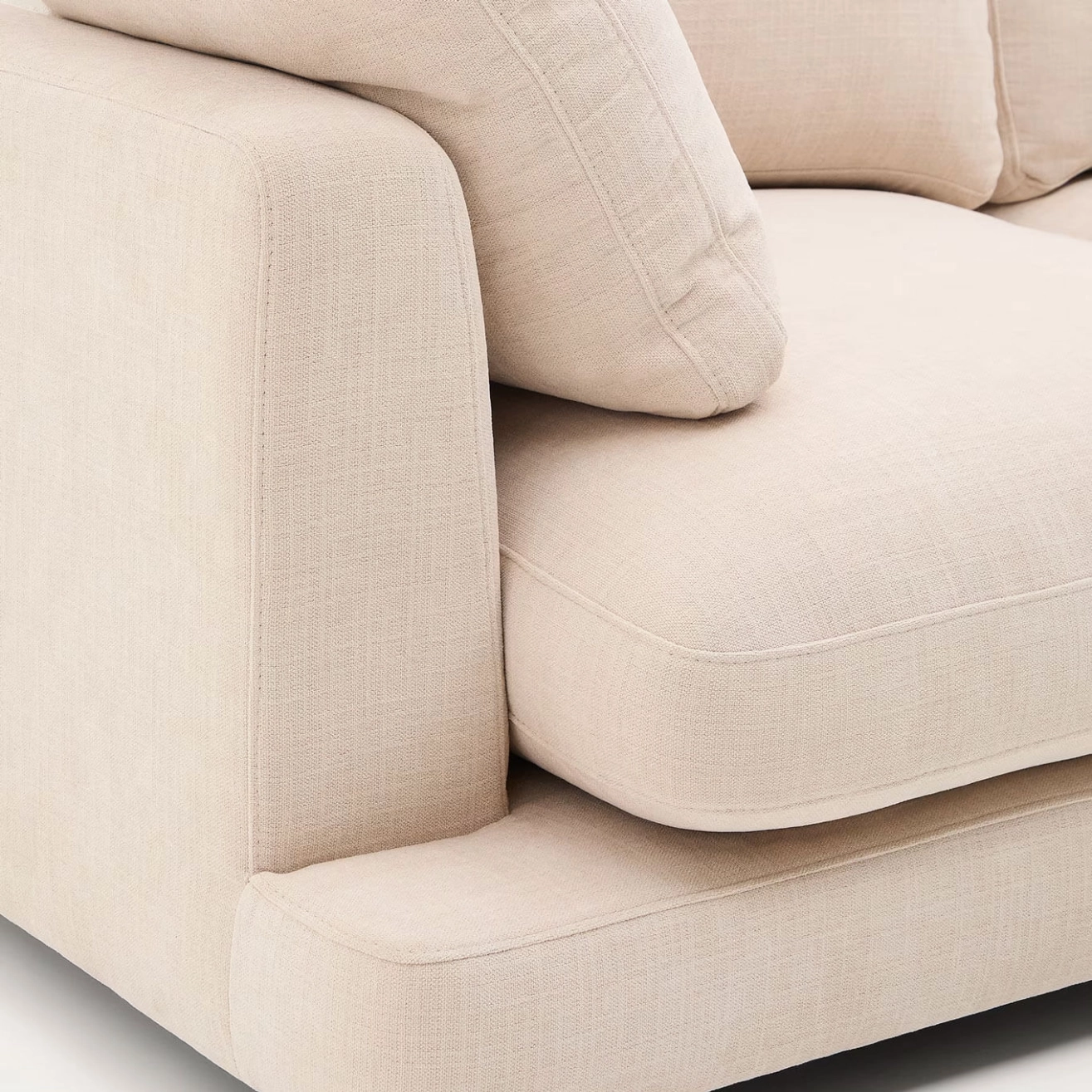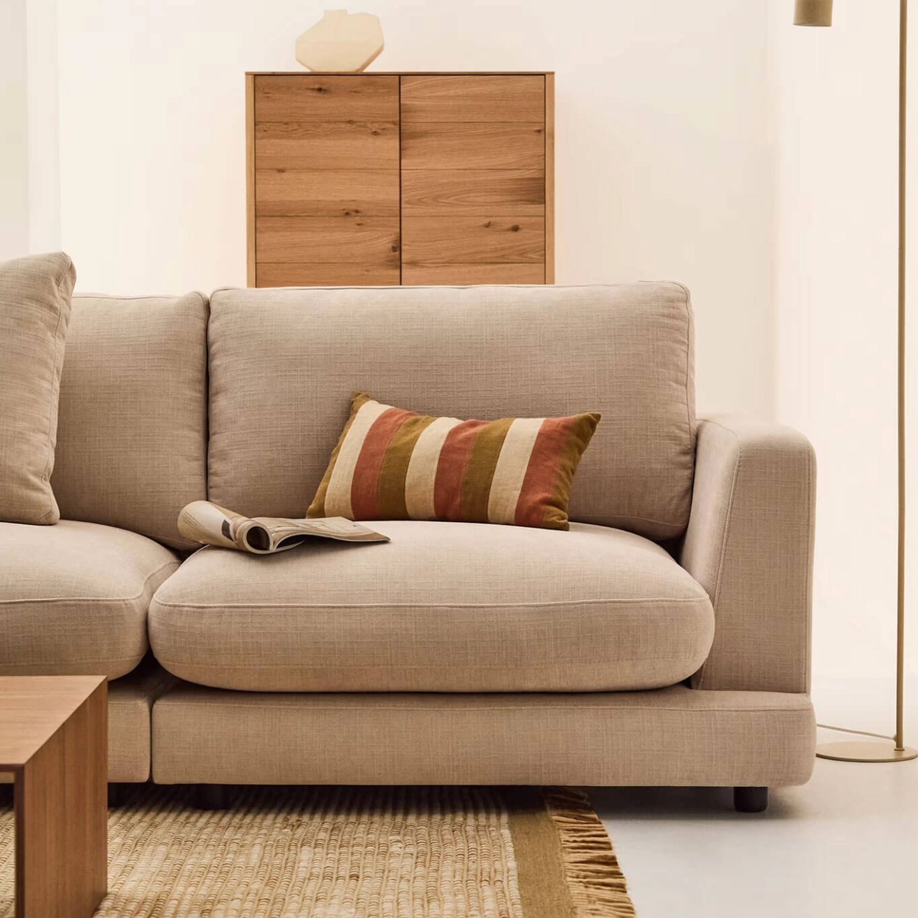 Kave Home en chenille beige allie design, confort et qualité pour transformer votre salon en un espace décontracté et élégant. Faisant partie de la collection Gala, il présente des proportions généreuses et des formes arrondies, créant une atmosphère chaleureuse et accueillante. Son revêtement en tissu chenille de haute qualité, à petite structure, antibactérien et traité antitaches, est à la fois durable et agréable au toucher. Les coussins sont garnis de fibre soft 100 % siliconée avec un noyau en mousse de 30 kg/m³, offrant un confort moelleux et enveloppant. Les assises, dossiers et coussins sont déhoussables et réversibles. Le fournisseur du tissu est certifié