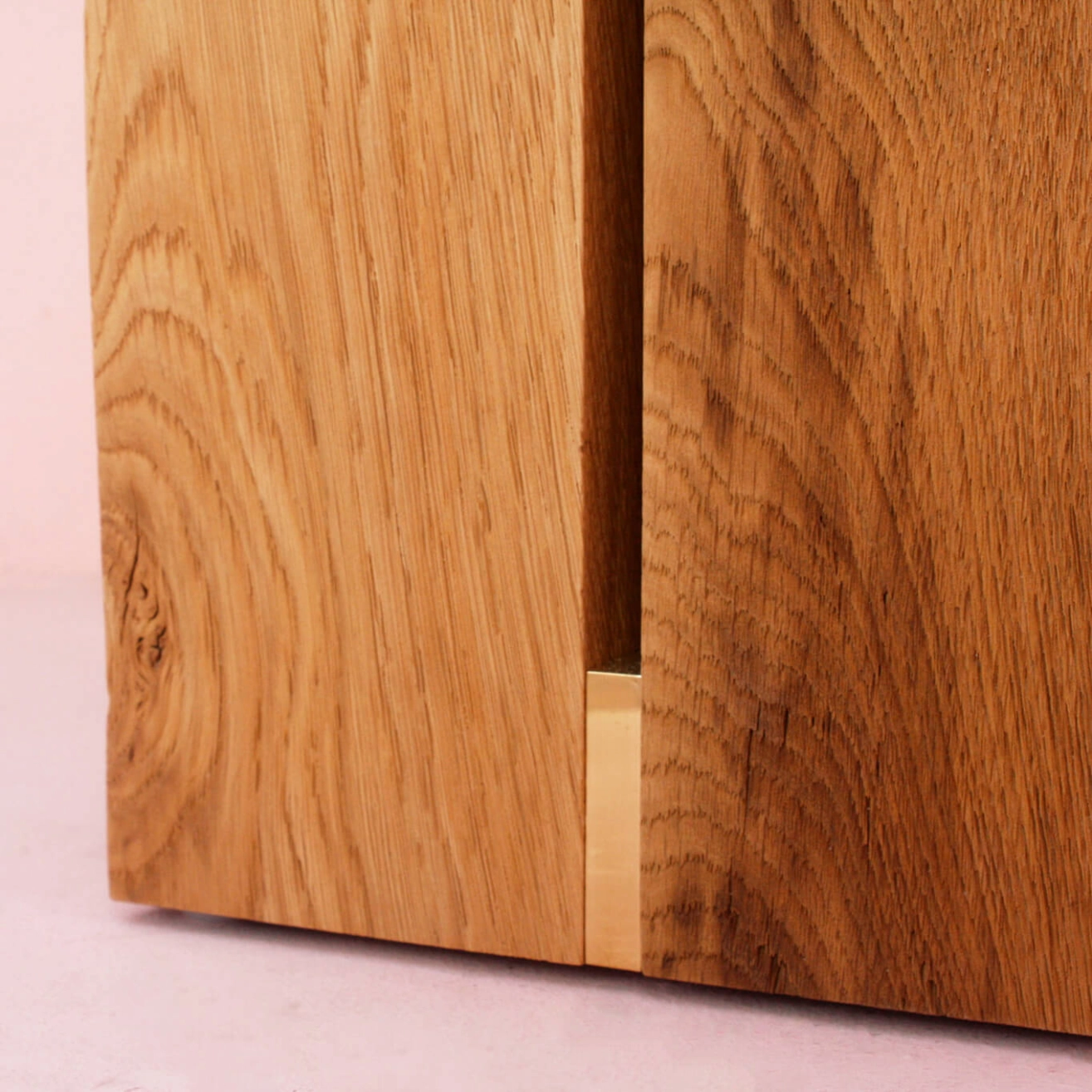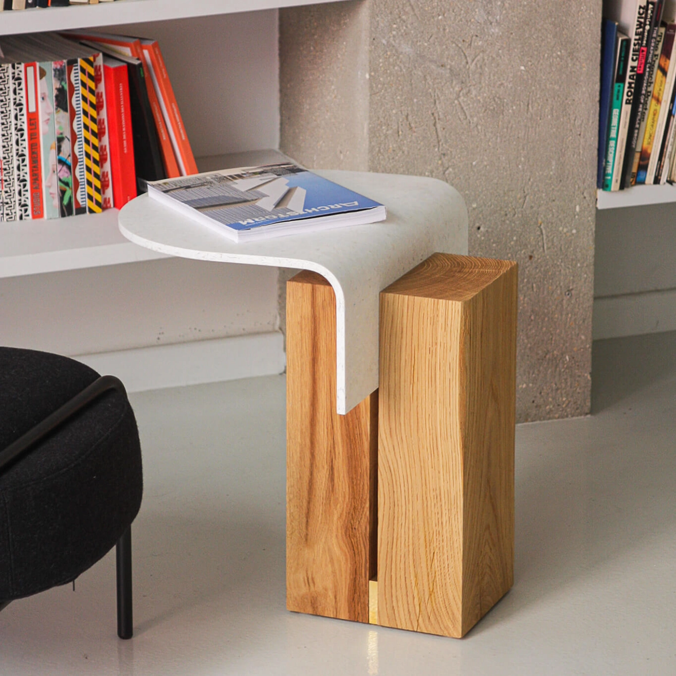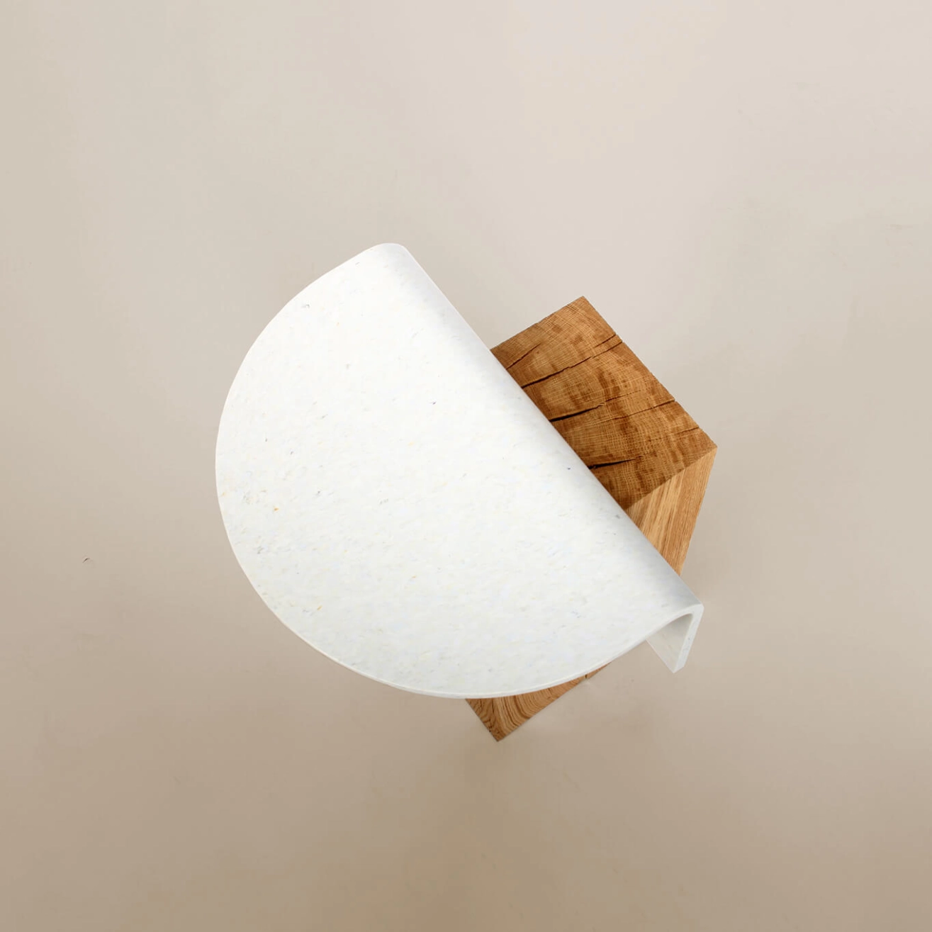 table Ghan se compose d’un plateau en plastique recyclé cintré, inséré entre deux blocs de bois massif, reposant sur une base en chêne recyclé — naturel ou teinté — issu notamment de chutes de traverses de chemin de fer. Une entretoise en laiton vient parfaire l’ensemble, apportant une touche d’élégance et de contraste. Chaque pièce présente des variations uniques, liées à la singularité des matériaux utilisés. Disponible en deux formats (S et M), la