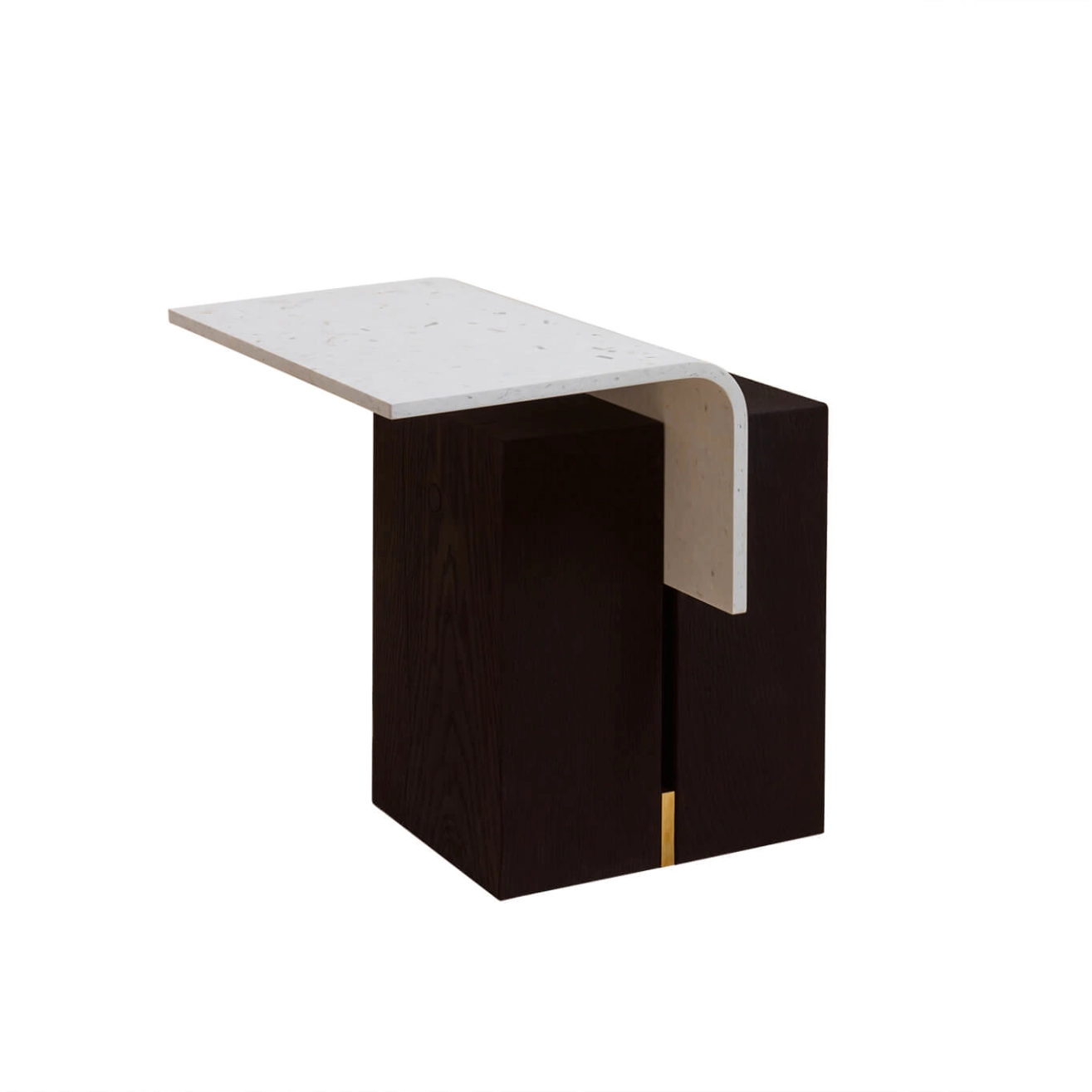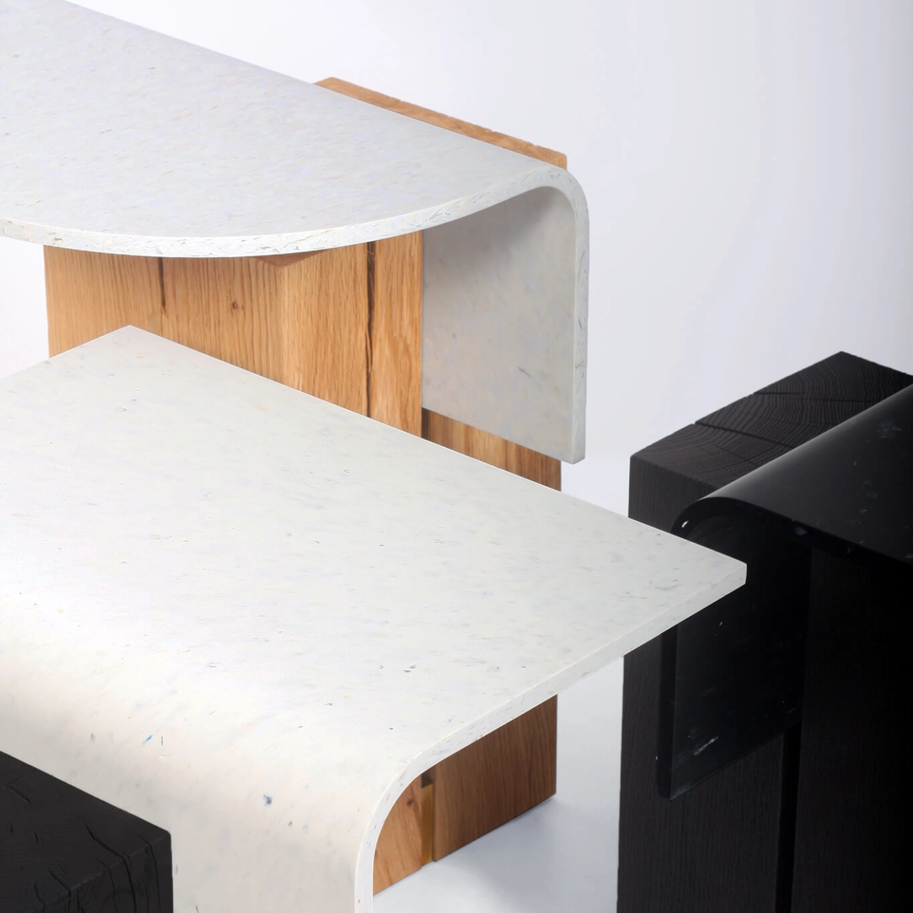 Chêne recyclé teinté au brou de noix, plastique recyclé, laiton