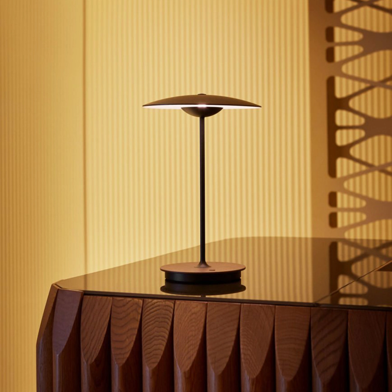 Le bois est un matériau difficile à travailler, mais la collection Ginger, conçue pour Marset, relève ce défi avec élégance. Les différentes couches de bois, de papier et de résines pressées sous haute pression donnent naissance à un stratifié presque parfaitement plat, capable de diffuser une lumière indirecte douce qui sublime subtilement les espaces. Au fil du temps, la collection Ginger s’est enrichie pour répondre à tous les besoins en éclairage. Elle se décline en suspensions, lampes à poser, appliques murales et lampadaires. Ces dernières se distinguent par leur simplicité structurelle remarquable et peuvent être associées entre elles pour créer des compositions lumineuses harmonieuses et originales. L’association de deux matériaux aux caractères très différents – bois et métal – confère à la collection Ginger une polyvalence exceptionnelle. Chaque espace, chaque projet, chaque style peut trouver sa solution avec une lampe Ginger, capable de répondre aux besoins lumineux et esthétiques les plus variés. La nouvelle version portable de table est équipée d’une batterie rechargeable lithium-ion, offrant une autonomie complète et une liberté totale d’usage. Sans contrainte de câbles, elle peut être déplacée facilement et utilisée partout, transformant instantanément les espaces et apportant une lumière chaleureuse et modulable où que vous soyez.