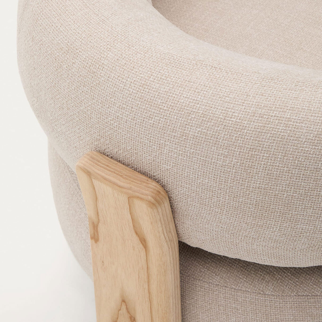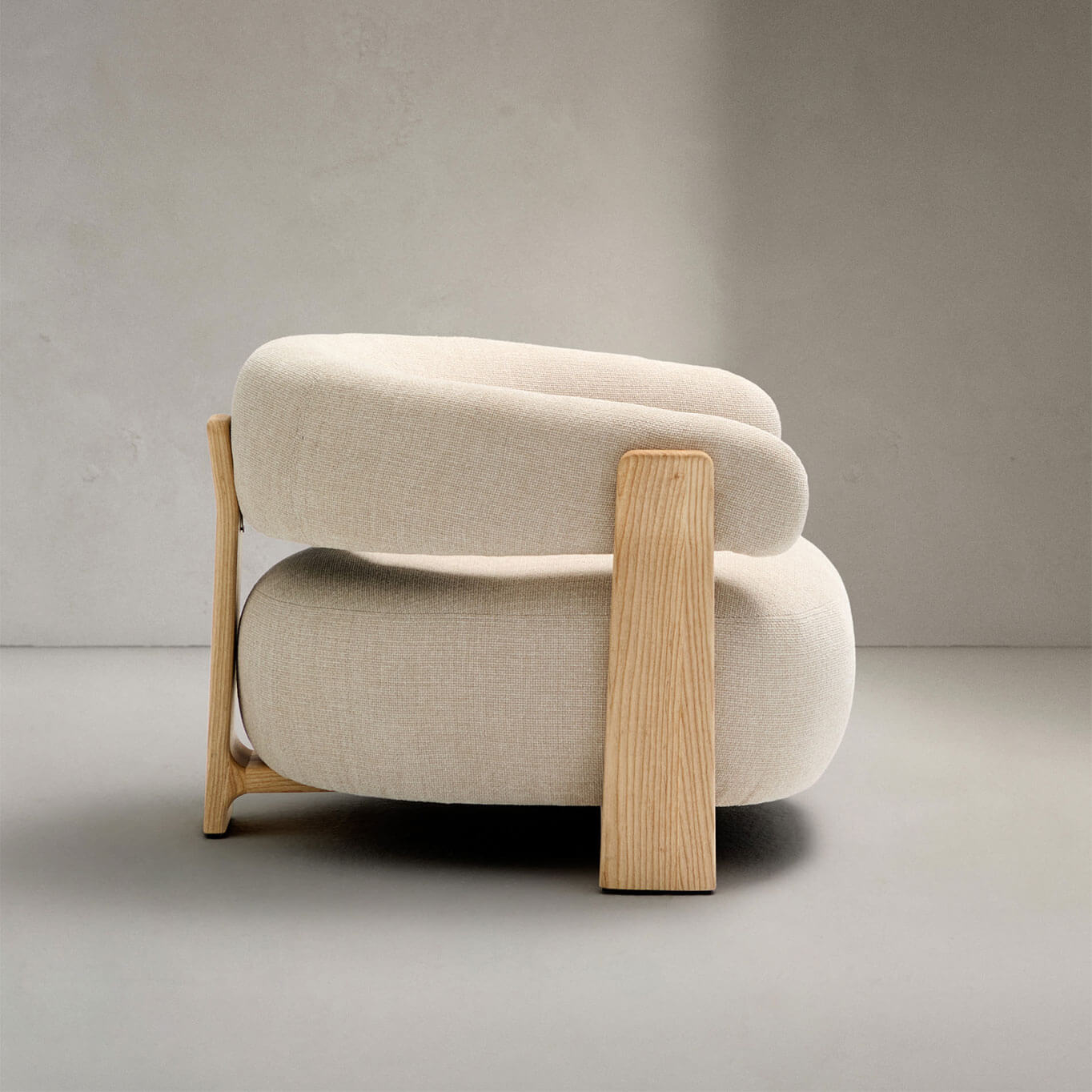 élégance intemporelle, inspirée du style scandinave des années 70, caractérisée par des formes généreuses, enveloppantes et stylisées. Son assise large et son dossier incurvé sont habillés d’un tissu chenille épais, au toucher doux et chaleureux, décliné dans une teinte subtilement nuancée. Ce tissu est composé de
