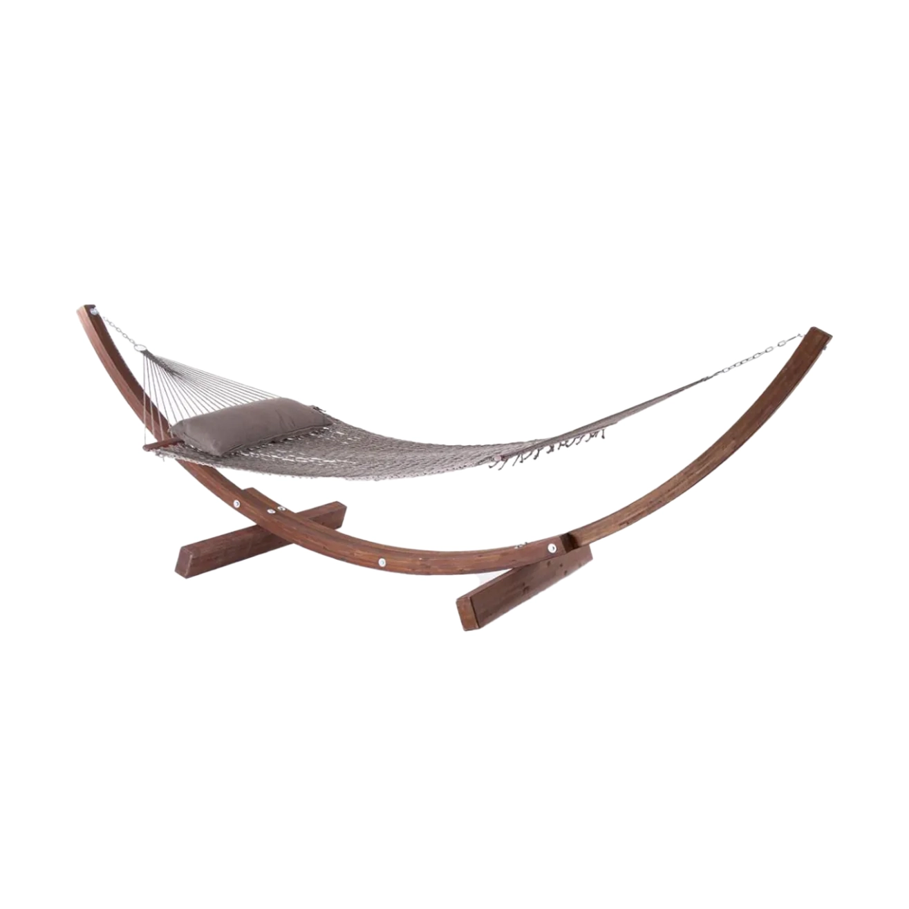 Bois finition noyer foncé, filet en polypropylène gris chiné et coussin en tissu