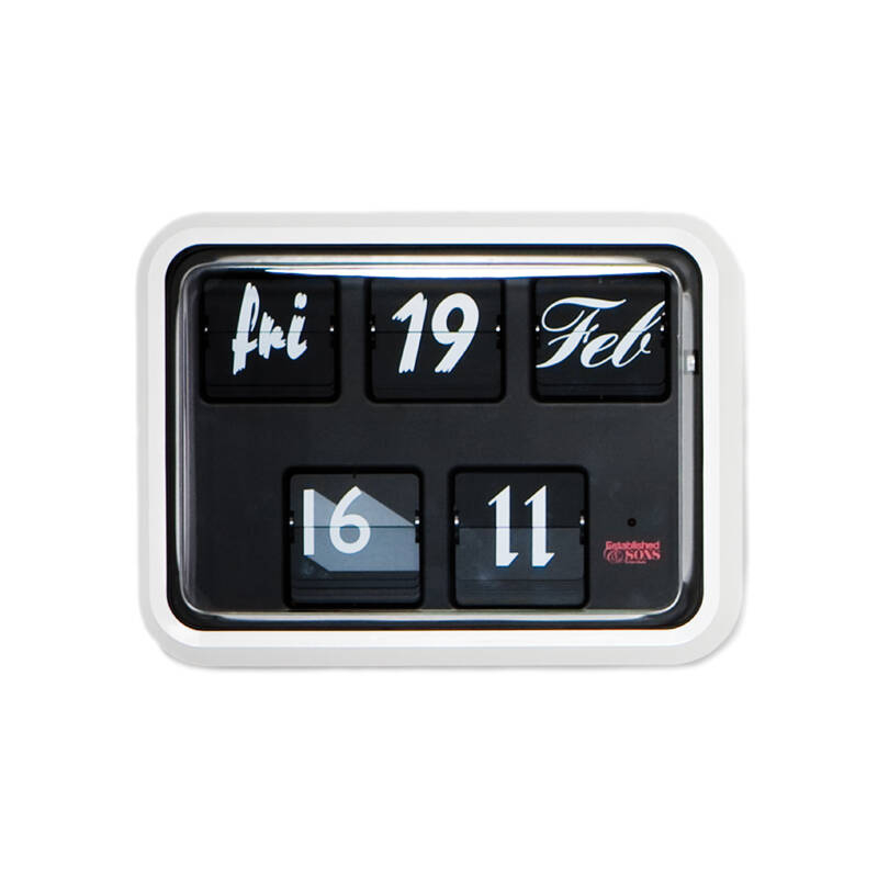 Avec la collection Font Clock, créée pour Established & Sons, le designer Sebatian Wrong a transformé un chef d’œuvre intemporel en un classique contemporain. L’horloge Font Clock part de cette idée simple : prendre une horloge iconique avec sa forme et son mécanisme distinctifs et y intégrer une grande variété de polices de caractères, pour créer un affichage toujours différent. Cette horloge est à la fois reconnaissable et intrigante. Elle est familière par sa forme et sa fonction, mais les différentes polices de caractères ajoutent un aspect contemporain et ludique. Font Clock se décline en trois versions : un petit modèle qui peut être posé ou accroché au mur, et deux versions murales, plus grandes, qui intègrent aussi un calendrier.