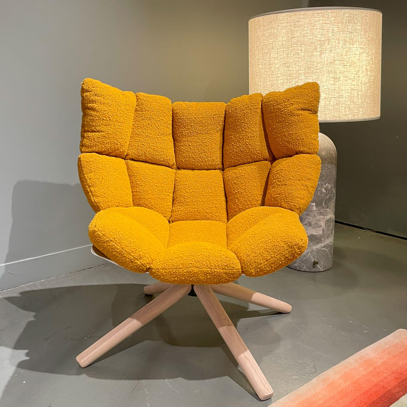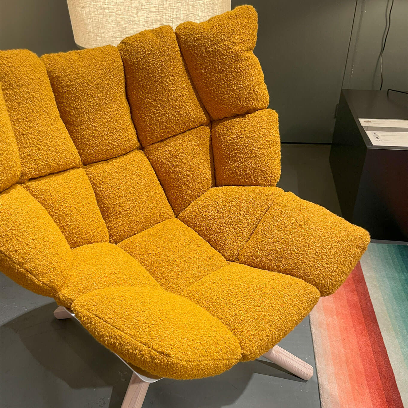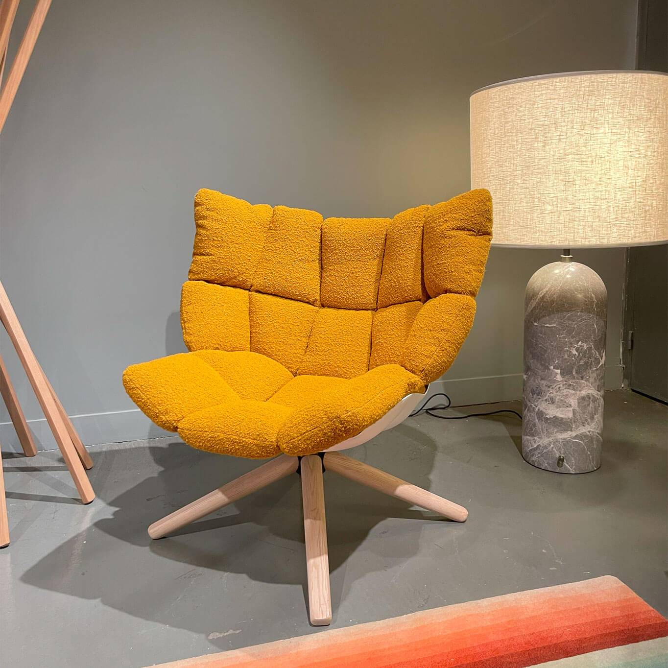 Le fauteuil Husk H2G d'occasion, conçu par Patricia Urquiola pour B&B Italia, se distingue par sa coque rigide en matériau plastique Hirek® blanche ou noire, habillée de coussins moelleux en fibre de polyester. Il repose sur une base pivotante en chêne clair brossé, chêne gris ou polyuréthane rigide verni noir. Ce fauteuil transforme votre salon en une véritable oasis de détente, exprimant un nouveau langage de design alliant confort, souplesse et ergonomie grâce à ses coussins abondants. Entièrement déhoussable, il offre également la possibilité de choisir des coussins dans d’autres coloris sur demande. Ici, la version avec base en chêne clair brossé, coque blanche et tissu.