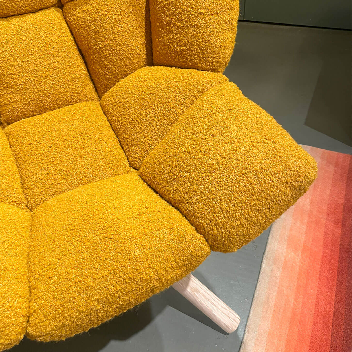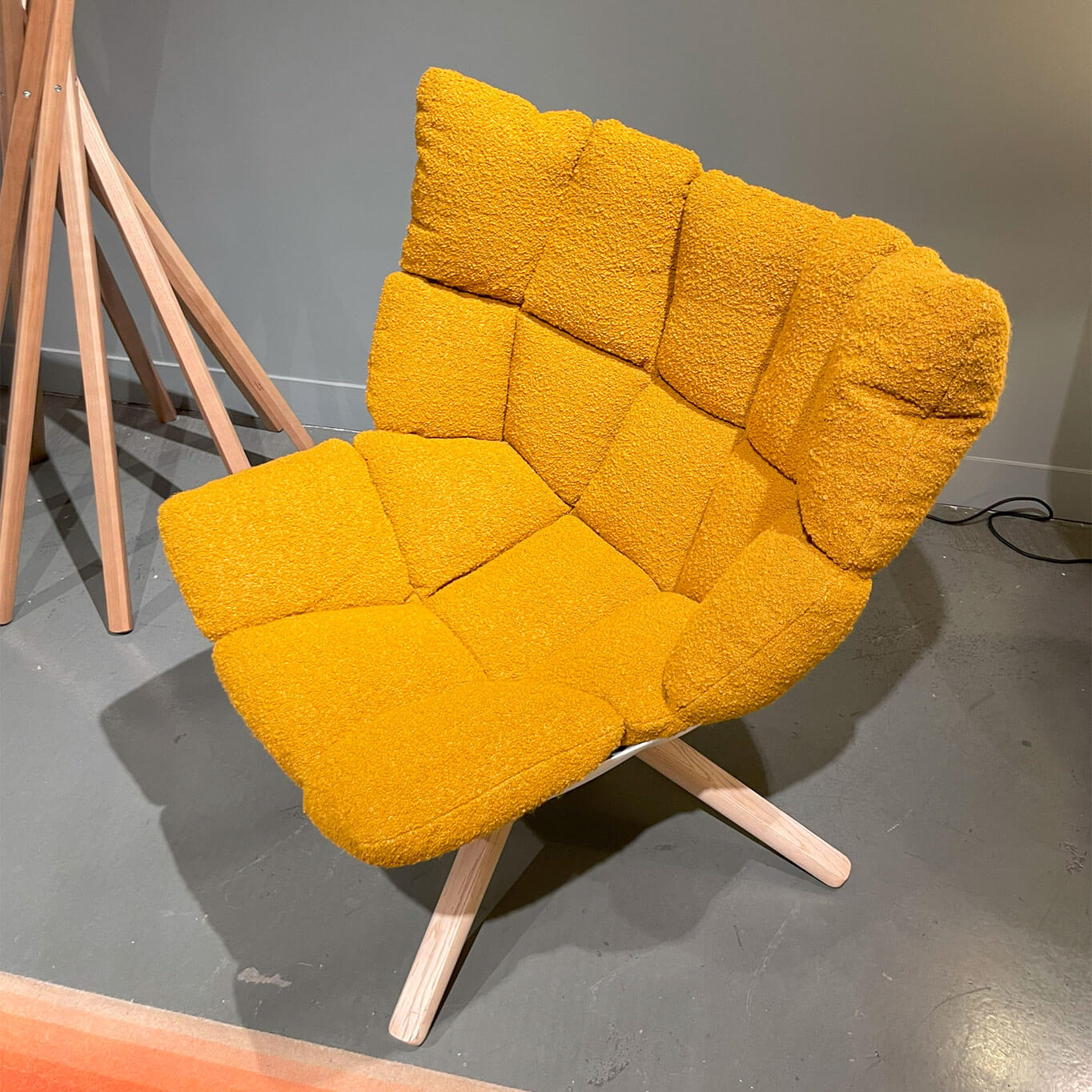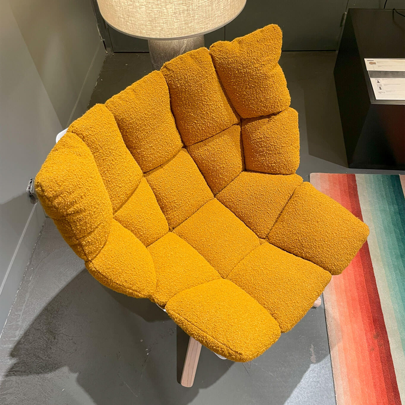 Le fauteuil Husk H2G d'occasion, conçu par Patricia Urquiola pour B&B Italia, se distingue par sa coque rigide en matériau plastique Hirek® blanche ou noire, habillée de coussins moelleux en fibre de polyester. Il repose sur une base pivotante en chêne clair brossé, chêne gris ou polyuréthane rigide verni noir. Ce fauteuil transforme votre salon en une véritable oasis de détente, exprimant un nouveau langage de design alliant confort, souplesse et ergonomie grâce à ses coussins abondants. Entièrement déhoussable, il offre également la possibilité de choisir des coussins dans d’autres coloris sur demande. Ici, la version avec base en chêne clair brossé, coque blanche et tissu.