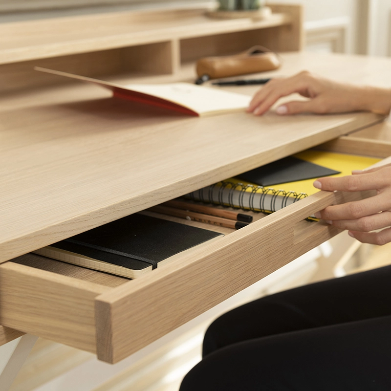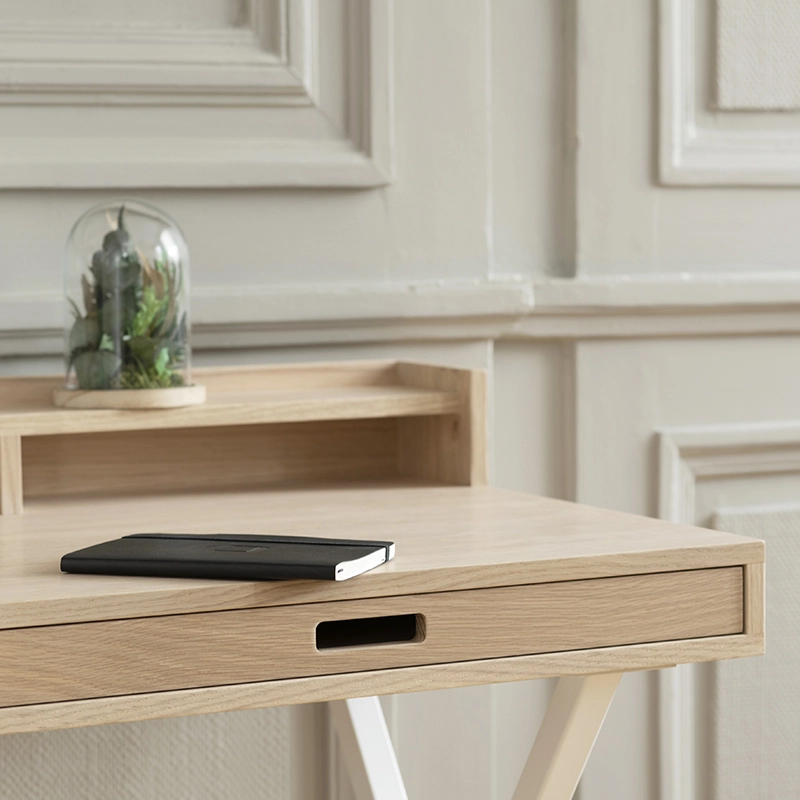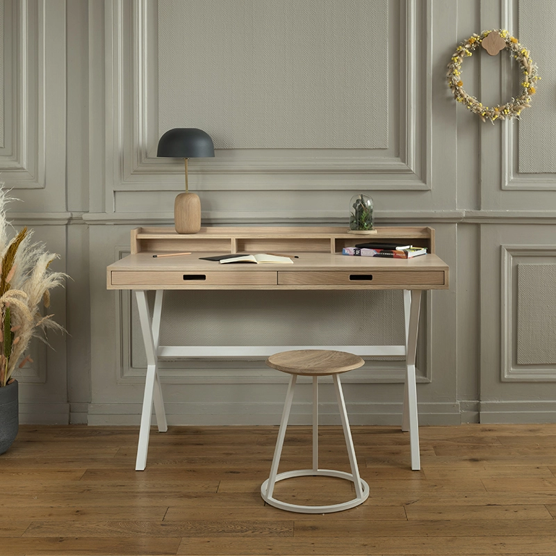 Dessiné par Florence Watine pour la marque Hartô, Hyppolite est un bureau compact, esthétique et fonctionnel. Il est équipé de trois grands tiroirs (38cm x 27cm x 5cm) et de trois niches de rangements, permettant de débarrasser facilement tout ce qui encombre le plateau pour mieux travailler. Fabriqué au Portugal, ce petit bureau design est réalisé en MDF et recouvert d'un placage chêne de haute qualité. Le piètement en métal, très architectural, assure une bonne stabilité. Avec ses proportions légères et ses différentes couleurs de piètements disponibles, Hyppolite s'intègre facilement dans tous les intérieurs.