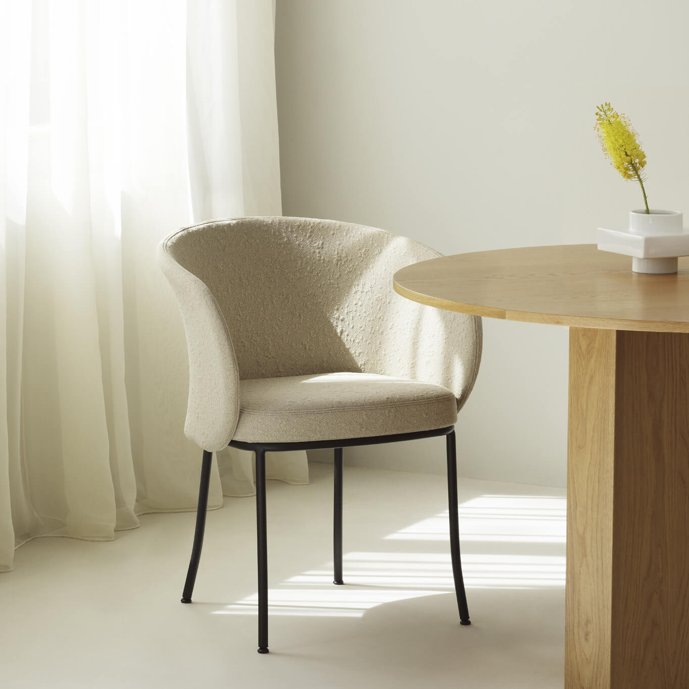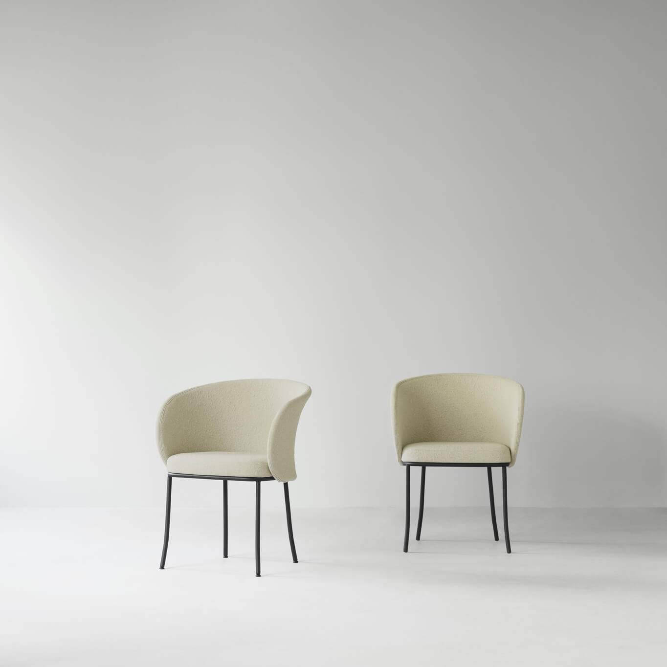 Le fauteuil Knit, signé Yuchen Wu pour Normann Copenhagen, se distingue par une silhouette gracieuse et une approche textile innovante. Ici, on le découvre avec une structure sobre en acier noir mat, alliant modernité et élégance discrète. Le dossier et l’assise sont façonnés d’un textile tricoté en polyester recyclé, tendu avec soin pour créer une image fluide, à la fois légère visuellement et généreuse au toucher. Les bords du dossier sont légèrement arrondis, conférant un enveloppement doux et un soutien confort optimal. Le piètement tubulaire lui donne une assise stable et un profil aérien : les pieds élancés et les tubes fins créent un contraste subtil avec l’assise volumineuse. Le design évoque une certaine légèreté, tout en conservant une présence affirmée dans l’espace. Esthétique et ergonomique, le fauteuil Knit de Normann Copenhagen s’adapte aussi bien à une salle à manger contemporaine qu’à un espace lounge ou un bureau créatif. Son mélange de douceur textile et de lignes épurées insuffle une atmosphère sophistiquée, sans superflu. C’est un fauteuil pensé pour l’intimité visuelle et sensorielle, invitant à s’asseoir et prolonger le regard. Simple mais raffiné,Knit est une belle illustration du design nordique moderne, humanisé et responsable.