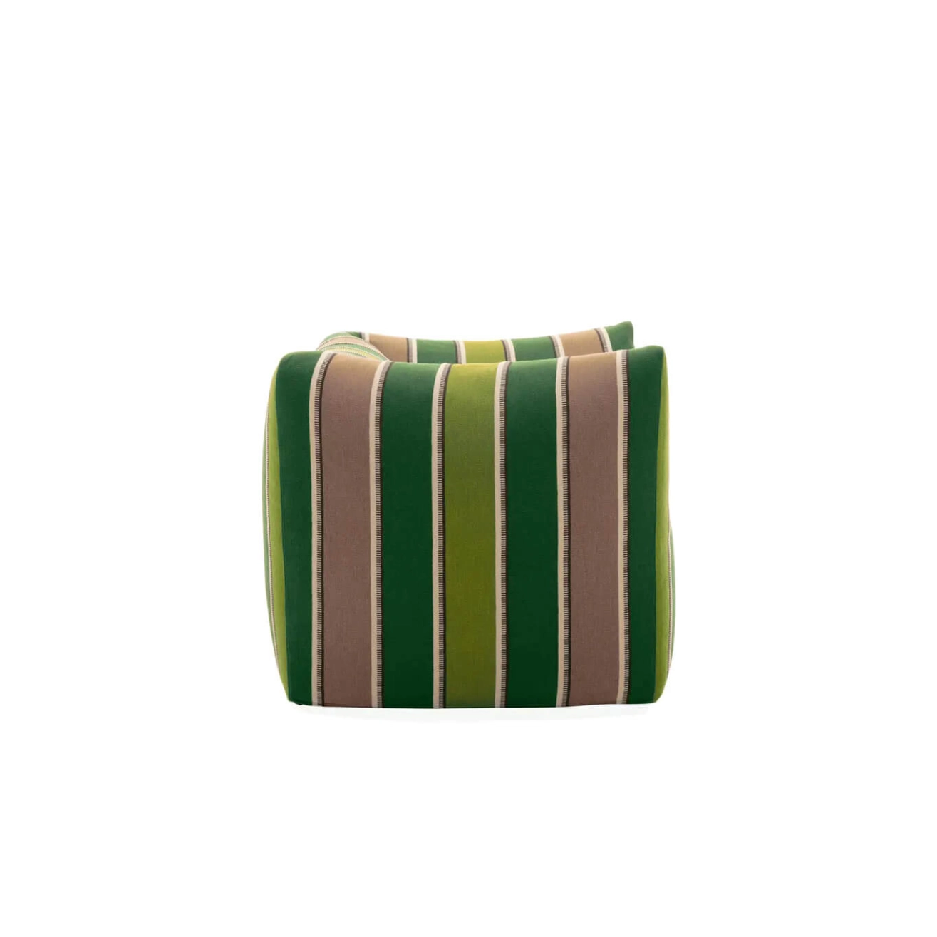 fauteuil La Bambola Outdoor se distingue par l’utilisation de matériaux résistants aux intempéries, offrant à la fois performance et esthétique pour les espaces extérieurs. Avec son tissu jacquard raie orange, ce fauteuil allie confort et élégance, créant un lieu de détente parfait dans les jardins ou les terrasses. Sa silhouette unique et généreuse permet d’apporter une touche de raffinement tout en offrant un confort exceptionnel.