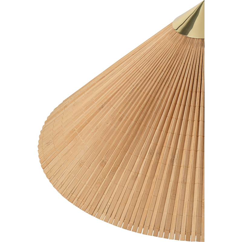 Pour cette version du lampadaire 9602, les lattes de bambou sont cousues ensemble pour former une surface plissée, qui est ensuite cousue à la main sur une doublure en lin, et fixée sur une structure en fil de fer. Ce procédé permet à l’abat-jour de créer un motif lumineux lorsque la lumière passe à travers les lattes de bambou, apportant une ambiance chaleureuse dans la pièce.