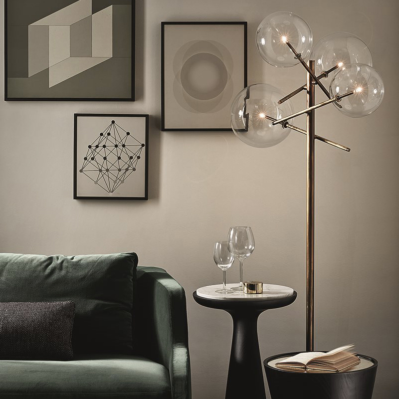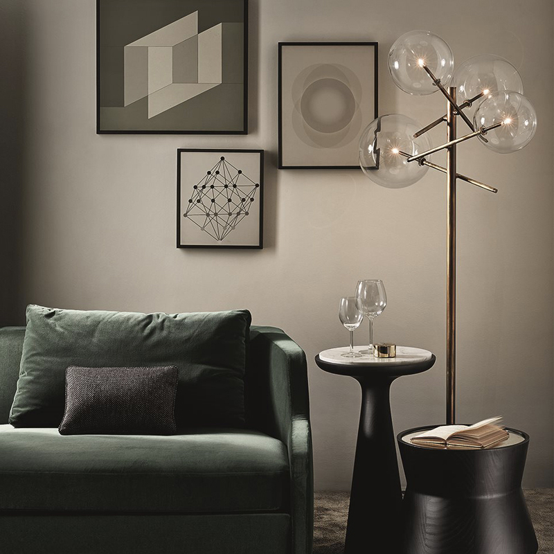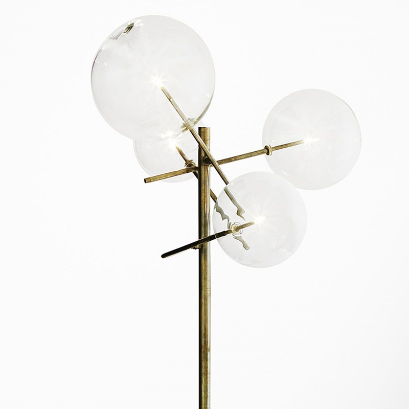 Le lampadaire Bolle de Gallotti & Radice est composé de 4 sphères en verre soufflé transparent fixées à une structure métallique en laiton bruni à la main. La finition de la structure en laiton bruni à la main est naturellement tachetée et irrégulière. Grâce à ce traitement artisanal, chaque luminaire Bolle est unique, ce qui le rend exceptionnel. Elégante et poétique, la collection Bolle est également disponible en version suspension.