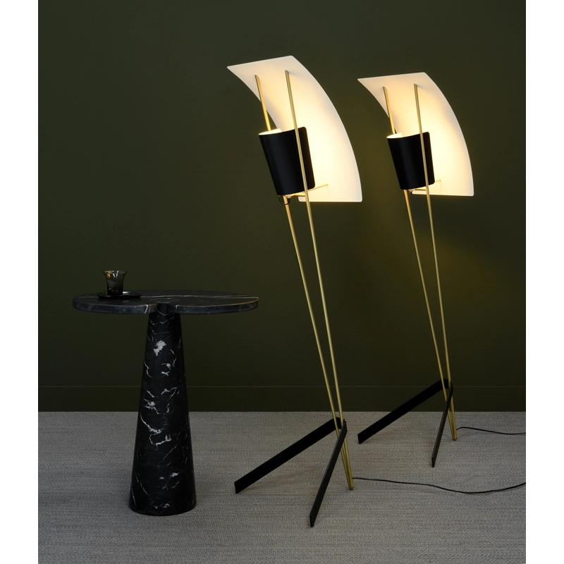 luminaire G30, à l’image d’une voile de bateau, invite le regard à l’évasion. Aux côtés d’un mat en laiton, pied et réflecteur se déclinent en métal noble noir ou blanc pour un univers monochrome ou contrasté.