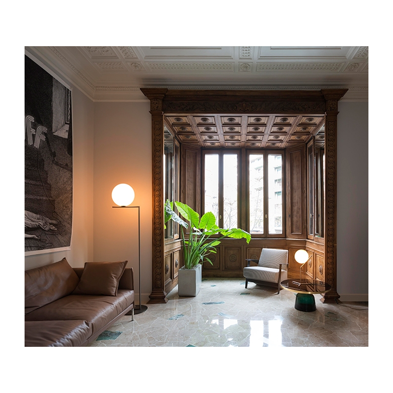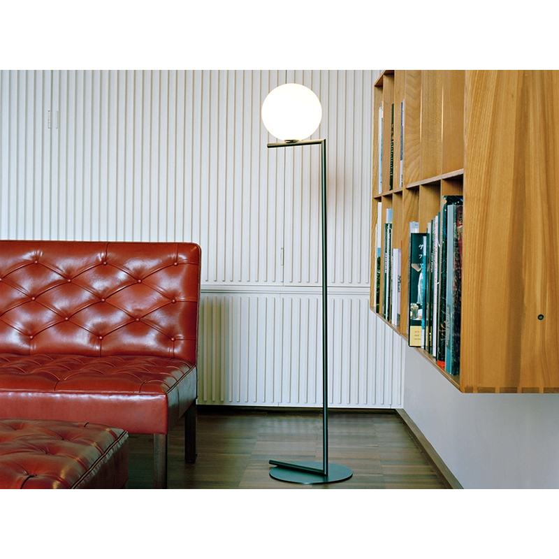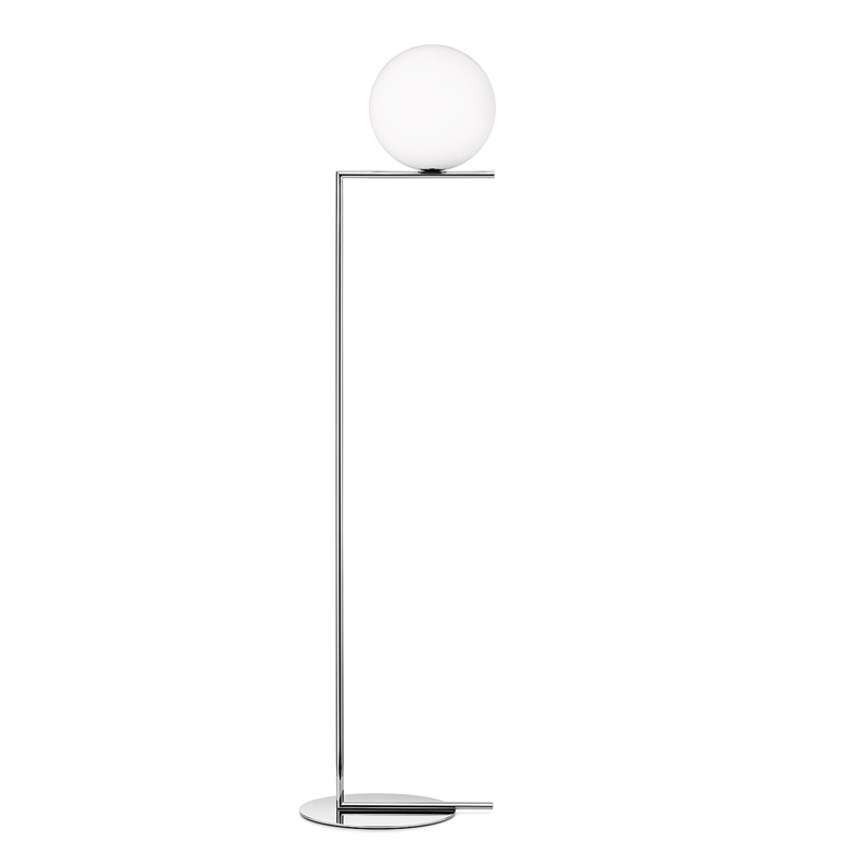lampadaire IC F2 est composé d'une sphère en verre soufflé qui semble être juste en équilibre sur une fine tige de métal. Editée par
